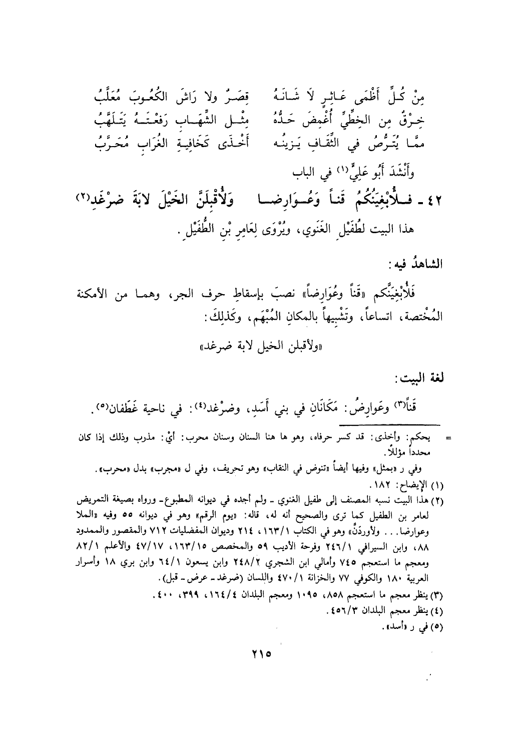 فلأبغينكمُ قناً وعوارضا ... ولأقبلنَّ الخيلَ لابةَ ضرغدِ