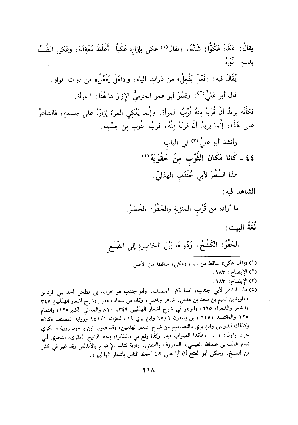 فكأنه يريد أن قربه منه قرب المرأة، وإنما يعكي المرء إزاره على جسمه، فالشاعر على هذا، إنما يريد أن قربه منه، قرب الثوب من جسمه.