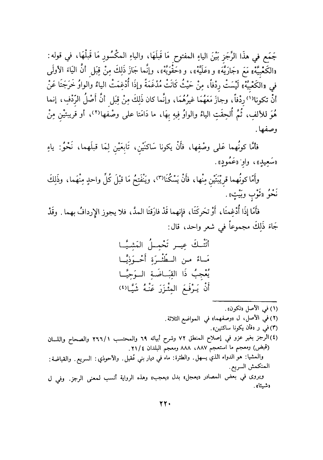 جمع هذا الرجز بين الياء المفتوح ما قبلها، والياء المكسور ما قبلها، في قوله: "الكعبية" مع "جارية" و"عليه"، و"حقويه"، وإنما جاز ذلك من قبل أن الياء الولى في "الكعبية" ليست ردفاً، من حيث كانت مدغمة وإذا أدغمت الياء والواو خرجتا عن أن تكونا ردفاً، وجاز معهما غيرهما، وإنما كان ذلك من قبل أن أصل الردف، إنما هو للألف، ثم ألحقت الياء والواو فيه بها، ما دامتا على وصفها، أو قريبتين من وصفها.