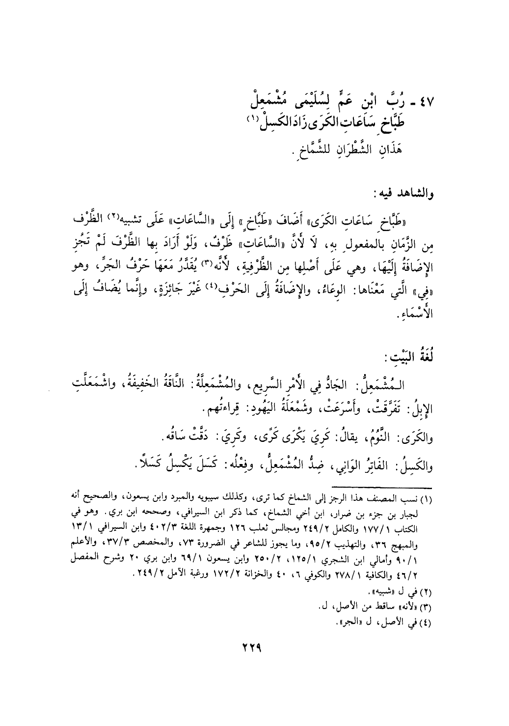 "طباخ ساعات الكرى" أضاف "طباخٍ" إلى "الساعات" على تشبيه الظرف من الزمان بالمفعول به، لا لأن "الساعات" ظرف، ولو أراد بها الظرف لم تجز الإضافة إليها، وهي على أصلها من الظرفية، لأنه يقدر معها حرف الجر، وهو "في" التي معناها: الوعاء، والإضافة إلى الحرف غير جائزة، وإنما يضاف إلى الأسماء.