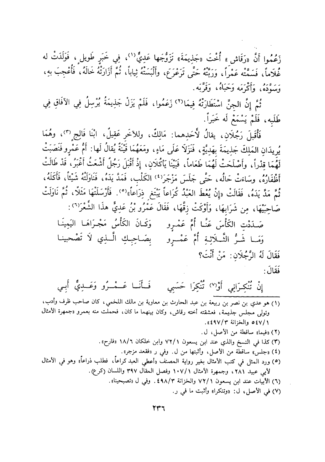زعموا ان "رقاش" أخت "جذيمة" تزوجها عدي، في خبر طويل، فولدت له غلاماً، فسمته عمراً، وربته حتى ترعرع، وألبسته ثياباً، ثم أزارته خاله، فأعجب به، وسوده، وأكرمه وحباه، وقربه.