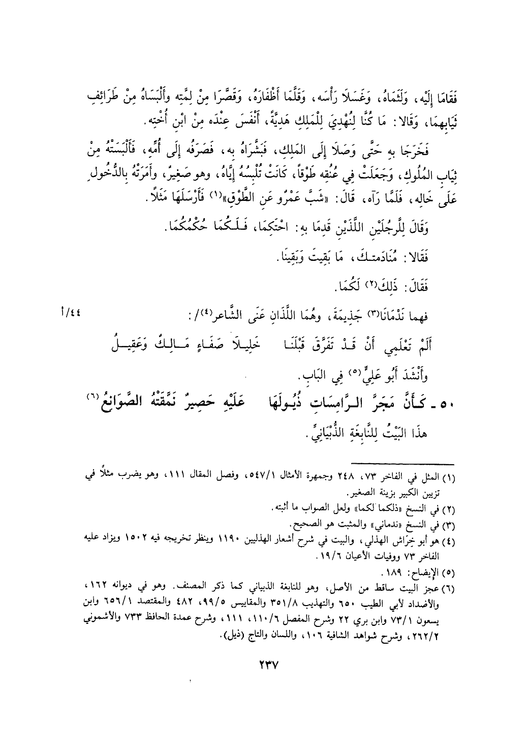 فخرجا به حتى وصلا إلى الملك، فشراه به، فصرفه إلى أمه، فألبسته من ثياب الملوك، وجعلت في عنقه طوقاً، كانت تلبسه إياه، وهو صغير، وأمرته بالدخول على خاله، فلما رآه، قال: "شب عمرو عن الطوق" فأرسلها مثلاً.