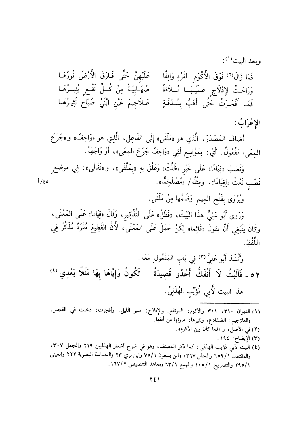 وروى أبو علي هذا البيت، "فظل" على التذكير، وقال "قياما" على المعنى، وكان ينبغي أن يقول "قائماً" لكن حمل على المعنى، لأن القطيع مفرد مذكر في اللفظ.
