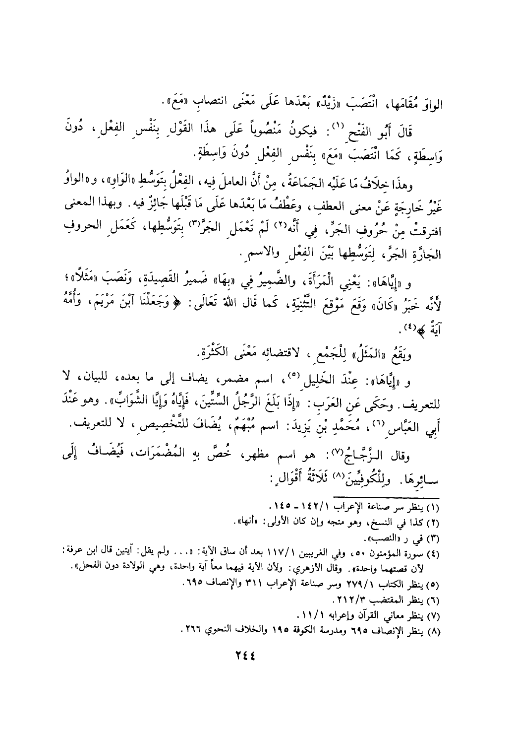 قال أبو الفتح: فيكون منصوباً على هذا القول بنفس الفعل، دون واسطة، كما انتصب "مع" بنفس الفعل دون واسطة.