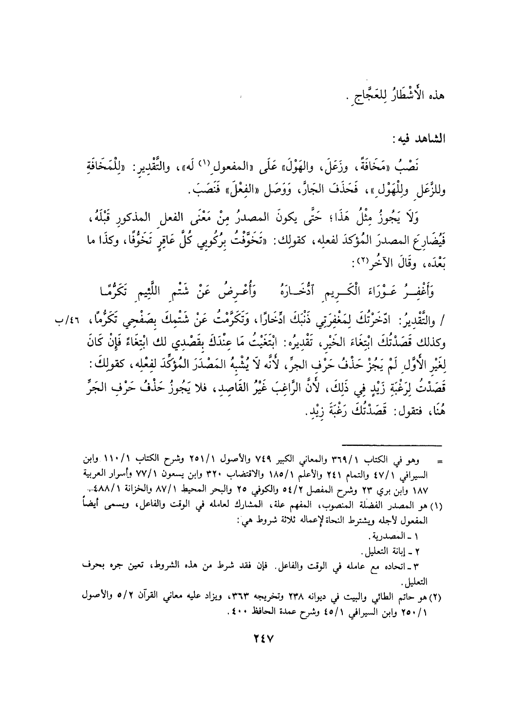 والتقدير: أدخرتك لمغفرتي ذنبك أدخاراً، وتكرمت عن شتمك بصفحي تكرماً، وكذلك قصدتك ابتغاء الخير، تقديره: ابتغيت ما عندك بقصدي لكم ابتغاء فإن كان لغير الأول لم يجز حذف حرف الجر، لأنه لا يشبه المصدر المؤكد لفعله، كقولك: قصدت لرغبة زيد في ذلك، لأن الراغب غير القاصد، فلا يجوز حذف حرف الجر هنا، فتقول: قصدتك رغبة زيد.