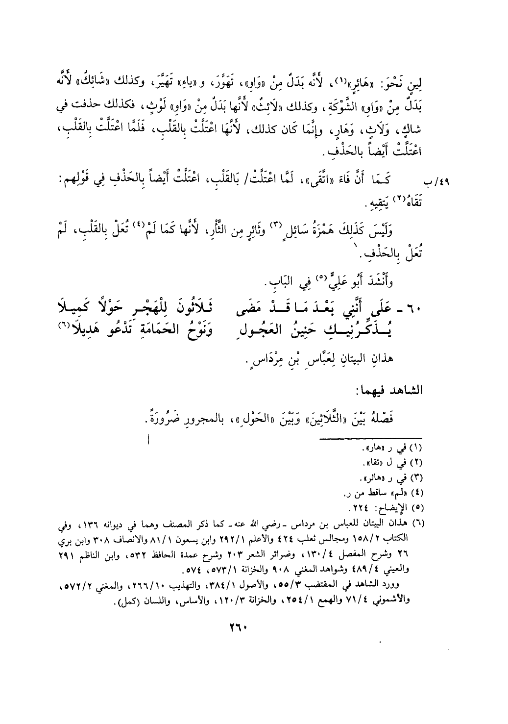 لين نحو: "هائر"، لأنه بدل من "واو"، تهور، و"ياء" تهير، وكذلك "شائك" لأنه بدل من "واو" الشوكة، وكذلك "لائث" لأنها بدل من واو لوث، فكذلك حذفت في شاك، ولاث، وهار، وإنما كان كذلك، لأنها اعتلت بالقلب، فلما اعتلت بالقلب، اعتلت أيضاً بالحذف.