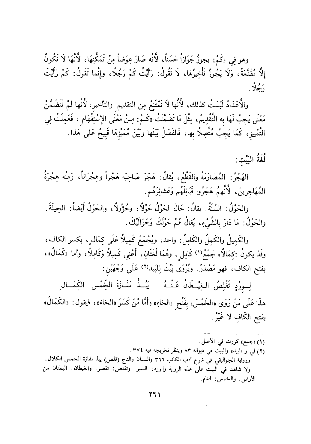 هذا على من روى "الخمس" بفتح "الخاء" وأما من كسر "الخاء"، فيقول: "الكمال" بفتح الكاف لا غير.