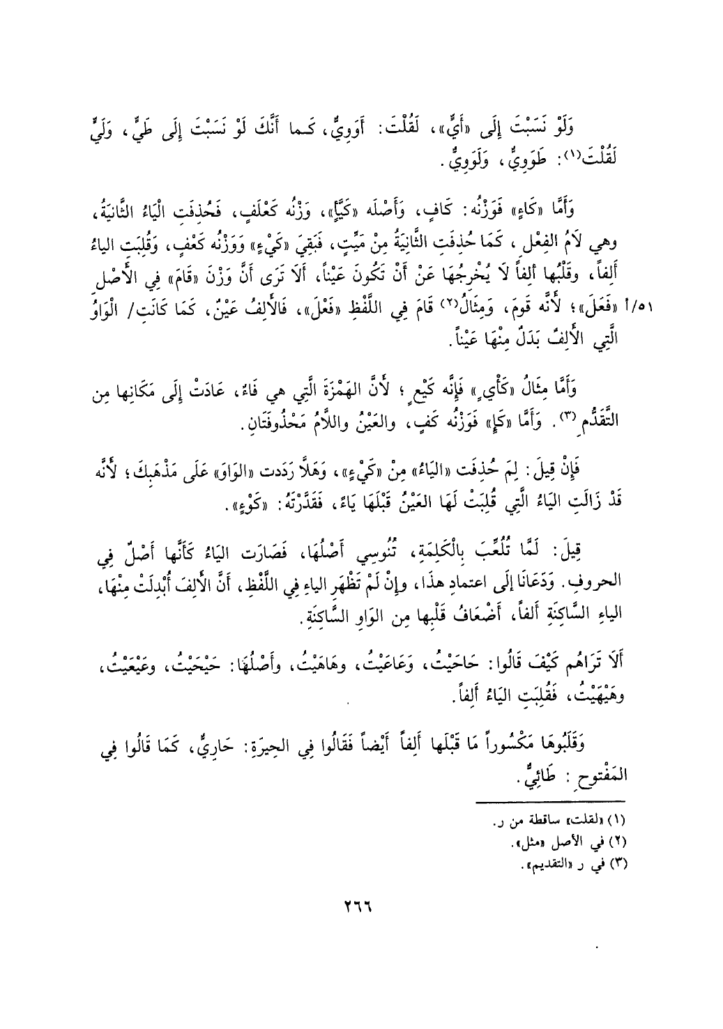 ولو نسبت إلى "أي"، لقلت: أووي، كما أنك لو نسبت إلى طي، ولي لقلت: طووي، ولووي.