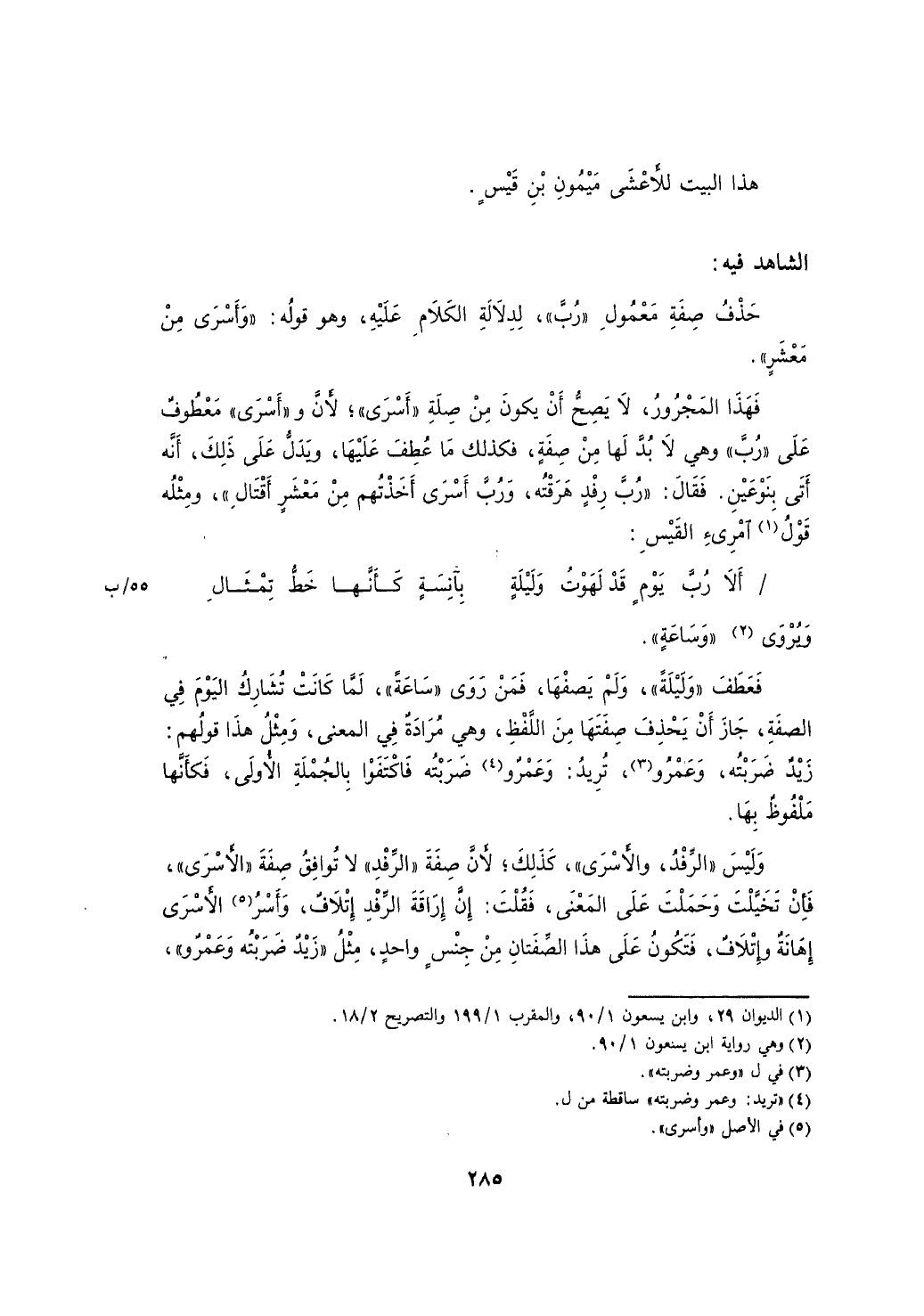 فعطف "وليلة"، ولم يصفها، فمن روى "ساعة"، لما كانت تشارك اليوم في الصفة، جاز أن يحذف صفتها من اللفظ، وهي مرادة في المعنى، ومثل هذا قولهم: زيد ضربته، وعمرو، تريد: وعمرو ضربته فاكتفوا بالجملة الأولى، فكأنها ملفوظ بها.
