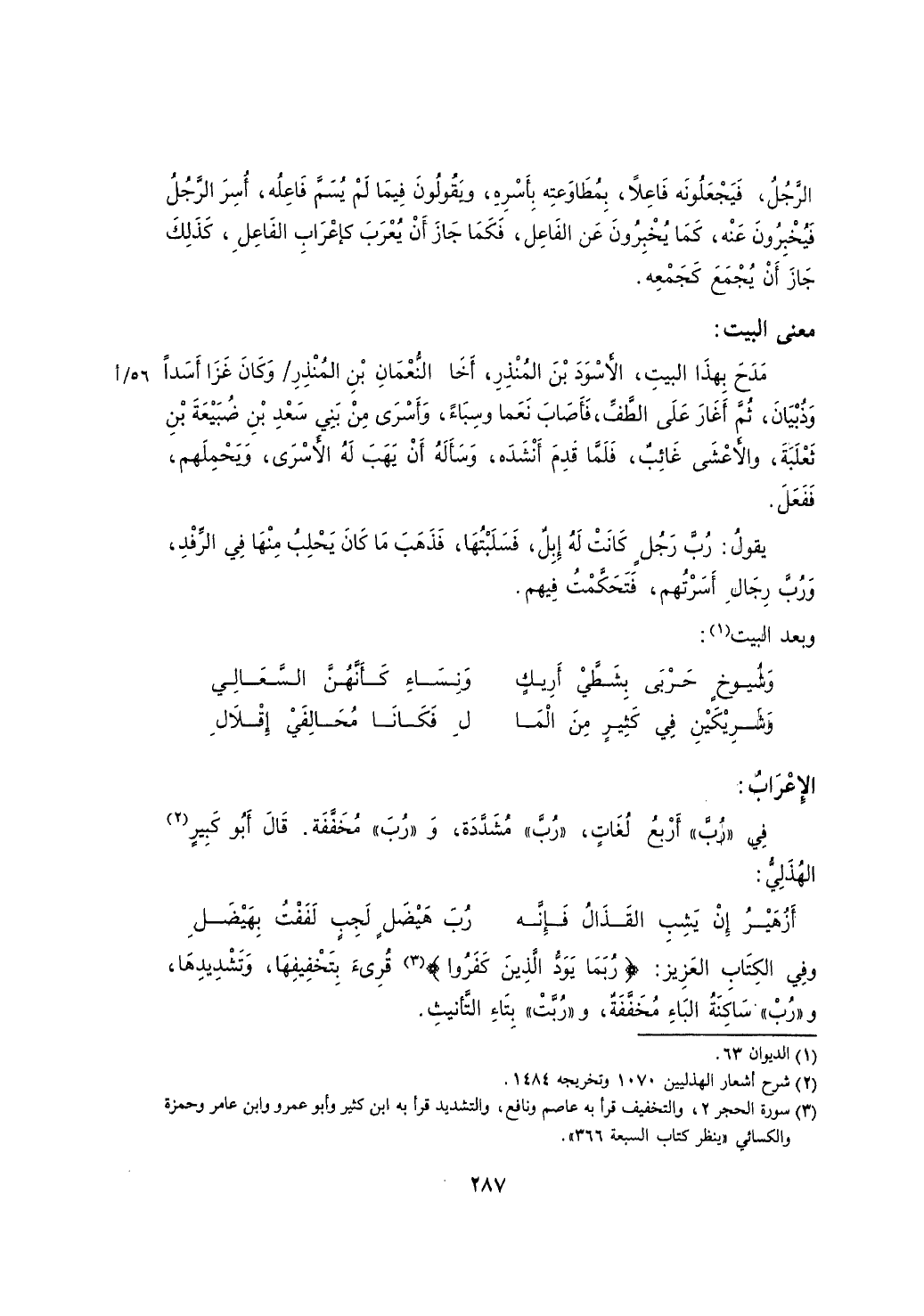 في "رب" أربع لغات، "رب" مشددة، و"رب" مخففة. قال أبو كبير الهذلي: