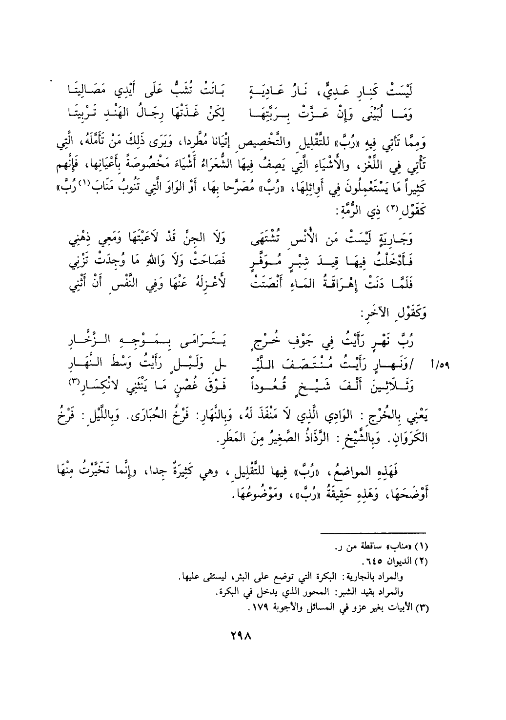 ومما تأتي فيه "رب" للتقليل والتخصيص إتيانا مطردا، ويرى ذلك من تأمله، التي تأتي في اللغز، والأشياء التي يصف فيها الشعراء أشياء مخصوصة بأعيانها، فإنهم كثيراً ما يستعملون في أوائلها، "رب" مصرحا بها، أو الواو التي تنوب مناب "رب" كقول ذي الرمة: