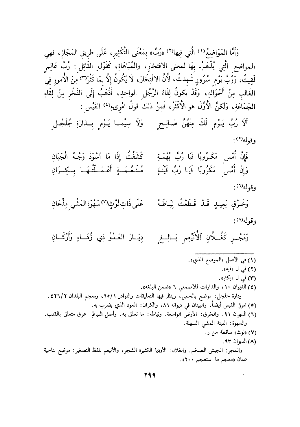 وأما المواضع التي فيها "رب" بمعنى التكثير، على طريق المجاز، فهي المواضع التي يذهب بها لمعنى الافتخار، والمباهاة، كقول القائل: رب عالم لقيت، ورب يوم سرور شهدت، لأن الافتخار، لا يكون إلا بما كثر من الأمور في الغالب من أحواله، وقد يكون لقاء الرجل الواحد، أذهب إلى الفخر من لقاء الجماعة، ولكن الأول هو الأكثر، فمن ذلك قول امرئ القيس: