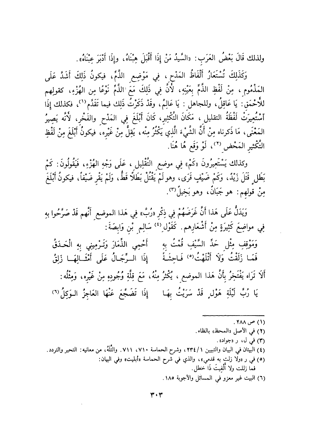 وكذلك يستعيرون "كم" في موضع التقليل، على وجه الهزء، فيقولون: كم بطل قتل زيد، وكم ضيف قرى، وهو لم يقتل بطلاً قط، ولم يقر ضيفاً، فيكون أبلغ من قولهم: هو جبان، وهو بخيل.
