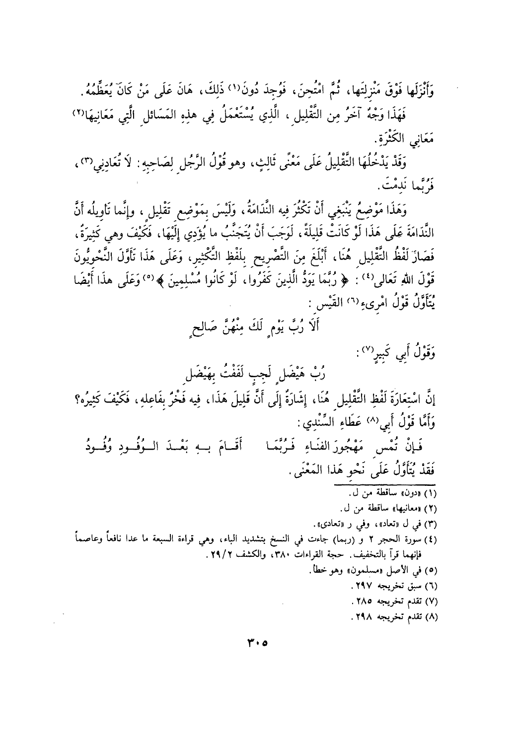 وهذا موضع ينبغي أن تكثر فيه الندامة، وليس بموضع تقليل، وإنما تأويله أن الندامة على هذا لو كانت قليلة، لوجب أن يتجنب ما يؤدي إليها، فكيف وهي كثيرة، فصار لفظ التقليل هنا، أبلغ من التصريح بلفظ التكثير، وعلى هذا تأول النحويون قول الله تعالى: (ربَّما يودُّ الَّذينَ كفروا، لو كانوا مسلمينَ) وعلى هذا أيضاً يتأول قول امرئ القيس: