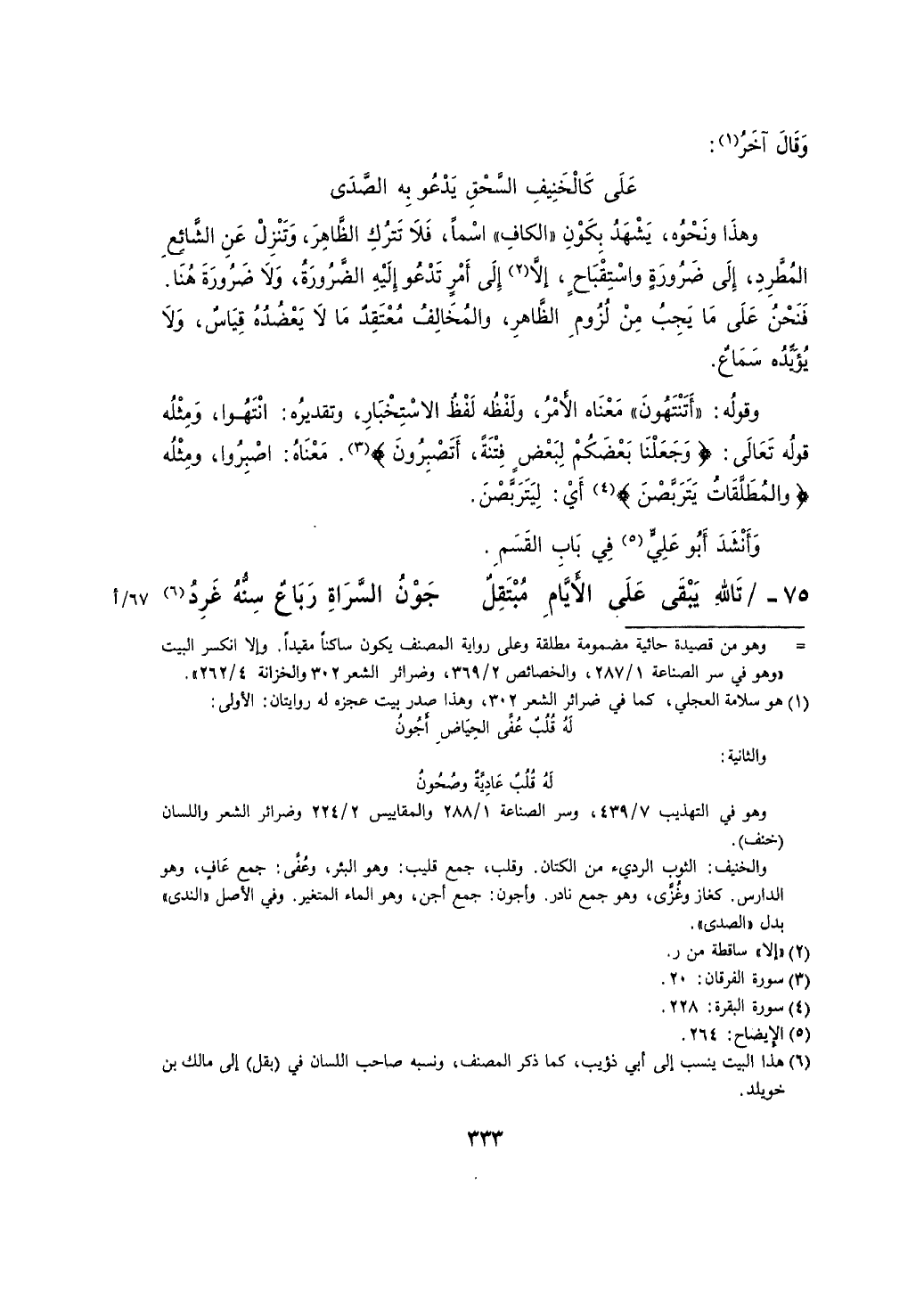 وهذا نحوه، يشهد بكون "الكاف" اسماً، فلا تترك الظاهر، وتنزل عن الشائع المطرد، إلى ضرورة واستقباح، إلا إلى أمر تدعو إليه الضرورة، ولا ضرورة هنا. فنحن على ما يجب من لزوم الظاهر، والمخالف معتقد ما لا يعضده قياس، ولا يؤيده سماع.