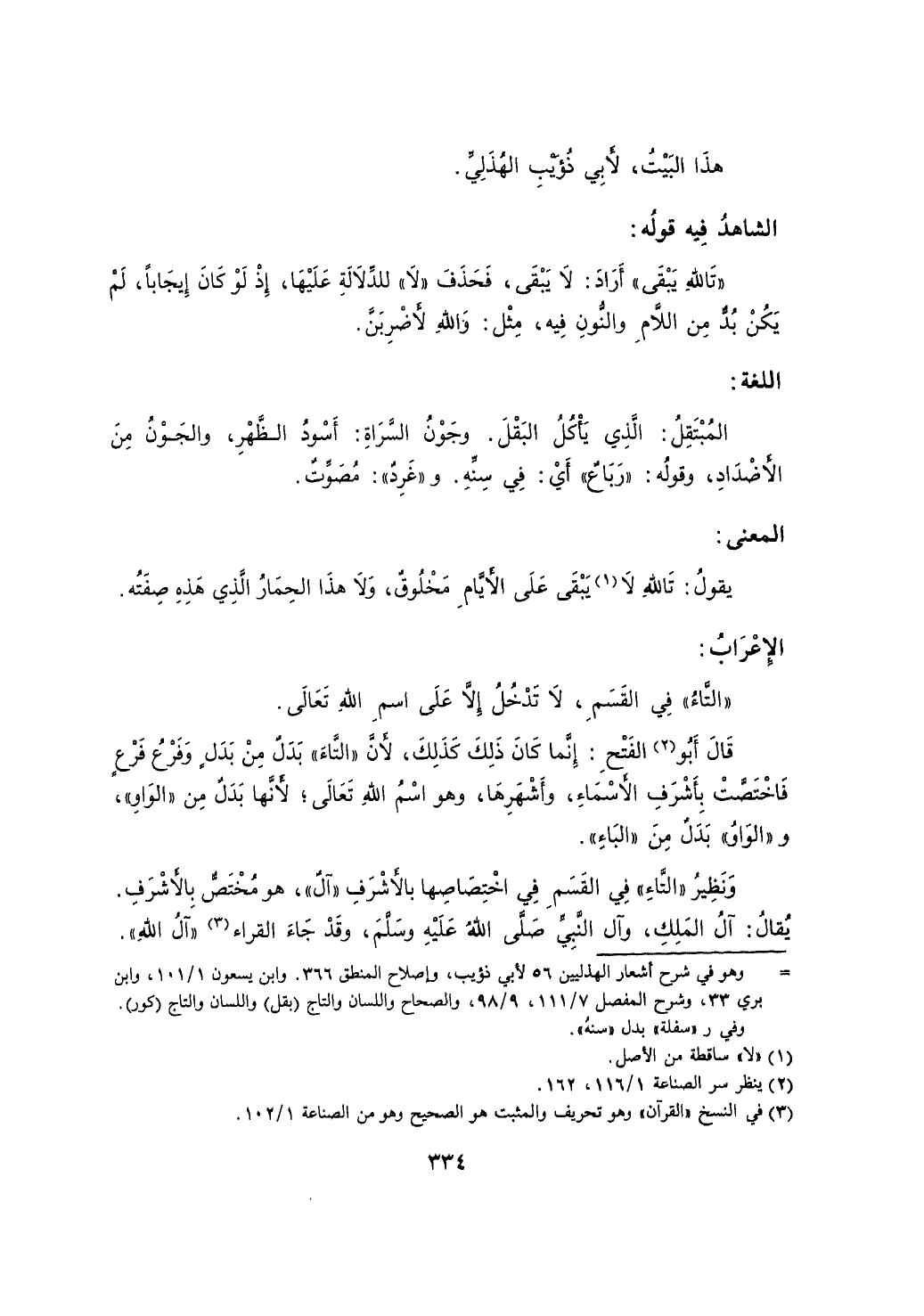 "تالله يبقى" أراد: لا يبقى، فحذف "لا" للدلالة عليها، إذ لو كان إيجاباً، لم يكن بد من اللام والنون فيه، مثل: والله لأضربن.