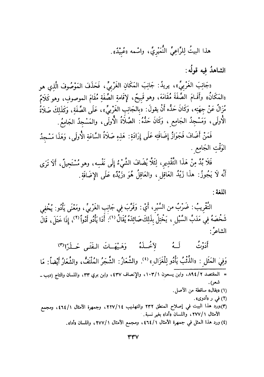 الشاهد فيه قوله: "جانب الغربي"، يريد: جانب المكان الغربي، فحذف الموصوف الذي هو "المكان" وأقام الصفة مقامه، وهو قبيح، لإقامة الصفة مقام الموصوف، وهو كلام مزال عن جهته، وكان حده أن يقول: "بالجانب الغربي"، إلى الصفة، وكذلك صلاة الأولى، ومسجد الجامع، وكان حده: الصلاة الأولى، والمسجد الجامع.