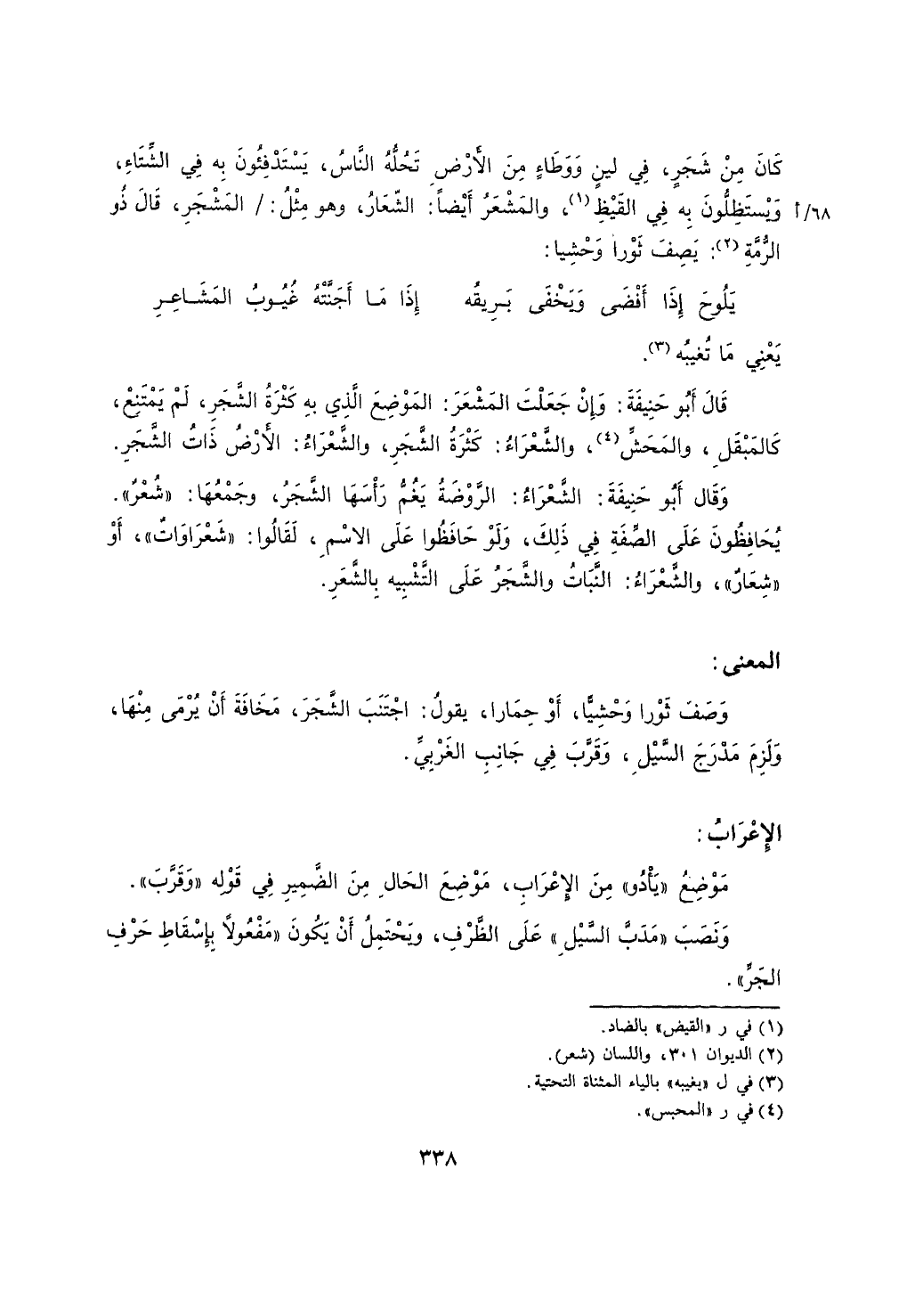 قال أبو حنيفة: وإن جعلت المشعر: الموضع الذي به كثرة الشجر، لم يمتنع، كالمبقل، والمحش، والشعراء: كثرة الشجر، والشعراء: الأرض ذات الشجر.