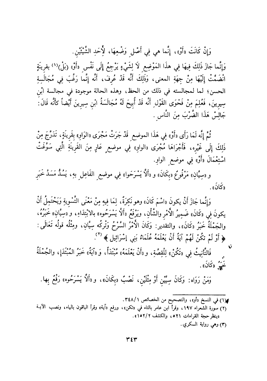 وإنما جاز ذلك فيها في هذا الموضع لا لشيء يرجع إلى نفس "أو" (بل) بقرينة انضمت إليها من جهة المعنى، وذلك أنه قد عرف، أنه ربما رغب في مجالسة الحسن؛ لما لمجالسته في ذلك من الحظ، وهذه الحالة موجودة في مجالسة ابن سيرين، فعلم من فحوى القول أنه قد أبيح له مجالسة ابن سيرين أيضاً كأنه قال: جالس هذا الضرب من الناس.