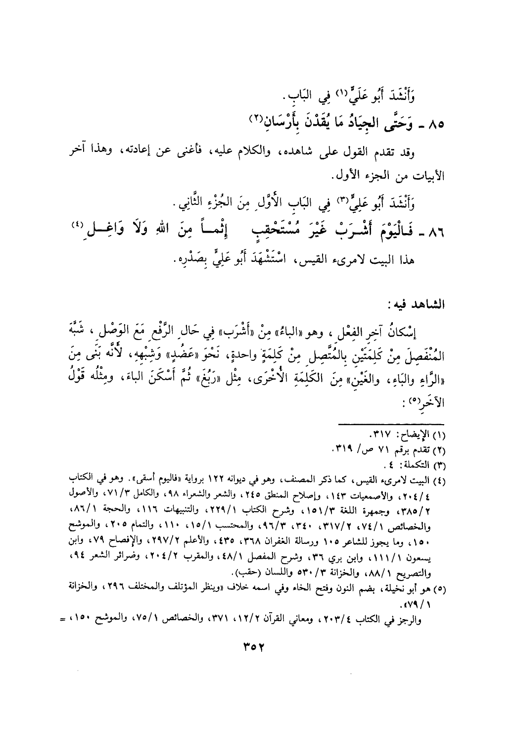 إسكان آخر الفعل، وهو "الباء" من "أشرب" في حال الرفع مع الوصل، شبه المنفصل من كلمتين بالمتصل من كلمة واحدة، نحو "عضد" وشبهه، لأنه بنى من "الراء والباء، والغين" من الكلمة الأخرى، مثل "ربغ" ثم أسكن الباء، ومثله قول الآخر: