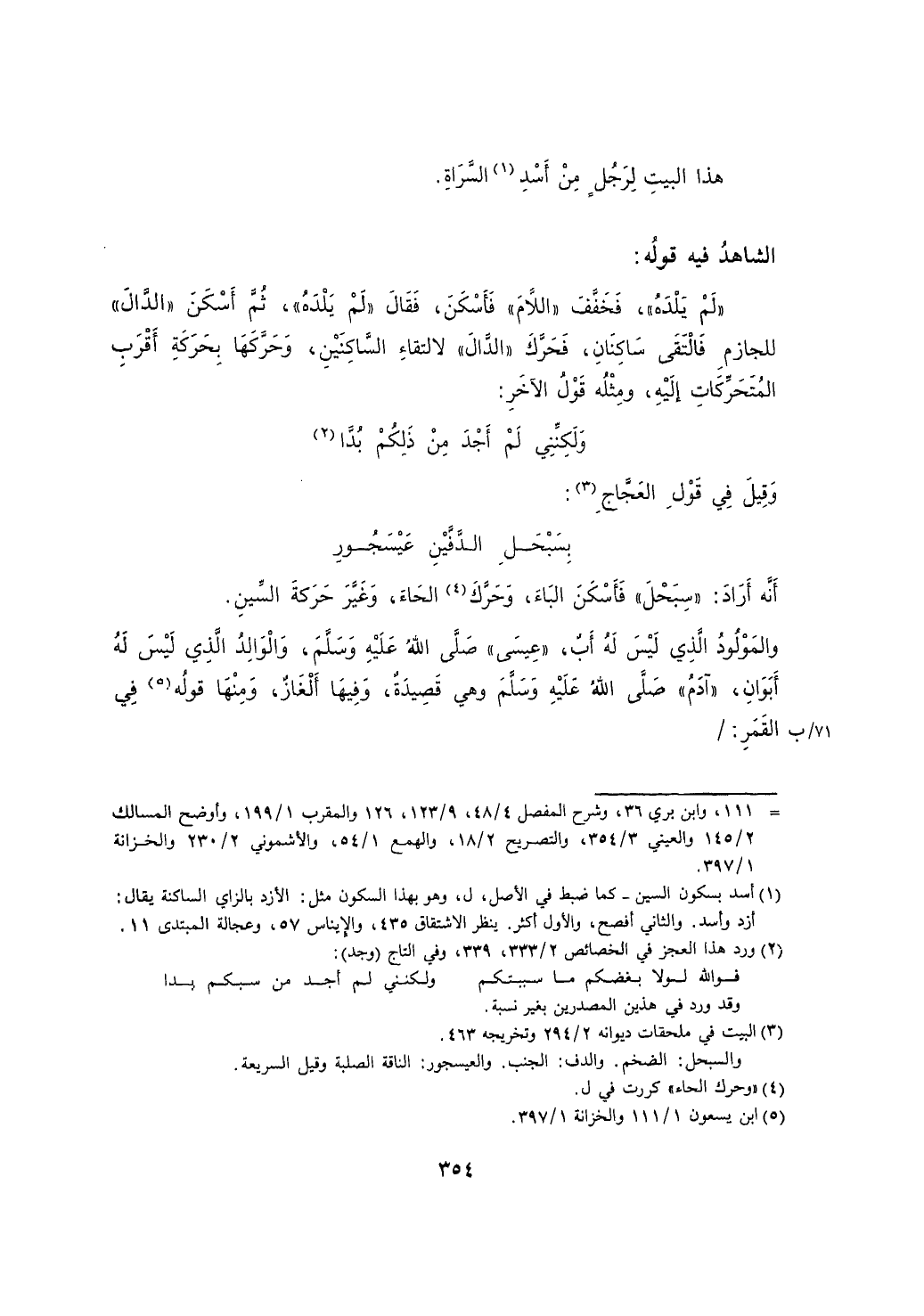 "لم يلده"، فخفف "اللام" فأسكن، فقال "لم يلده"، ثم أسكن "الدال" للجازم فالتقى ساكنان، فحرك "الدال" لالتقاء الساكنين، وحركها بحركة أقرب المتحركات إليه، ومثله قول الآخر: وقيل في قول العجاج: