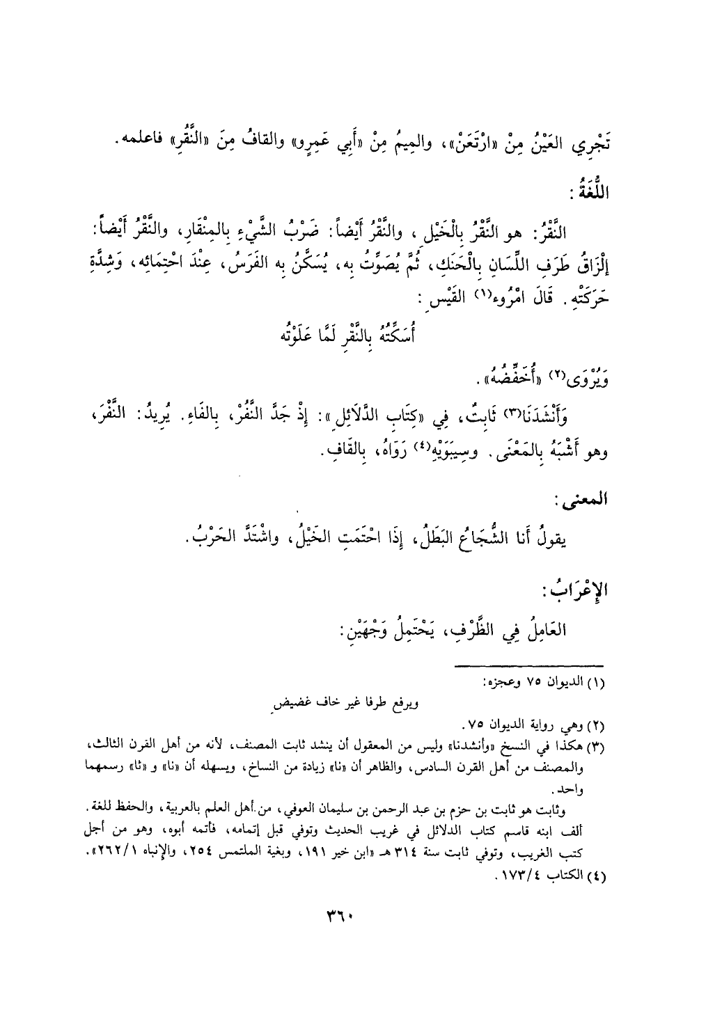 والثاني: أن يكون قد عرف منه الغناء والنجدة، فكأنه قال: أنا المغني، أو أنا النجد إذ جد النقر. ومثله قول الآخر: