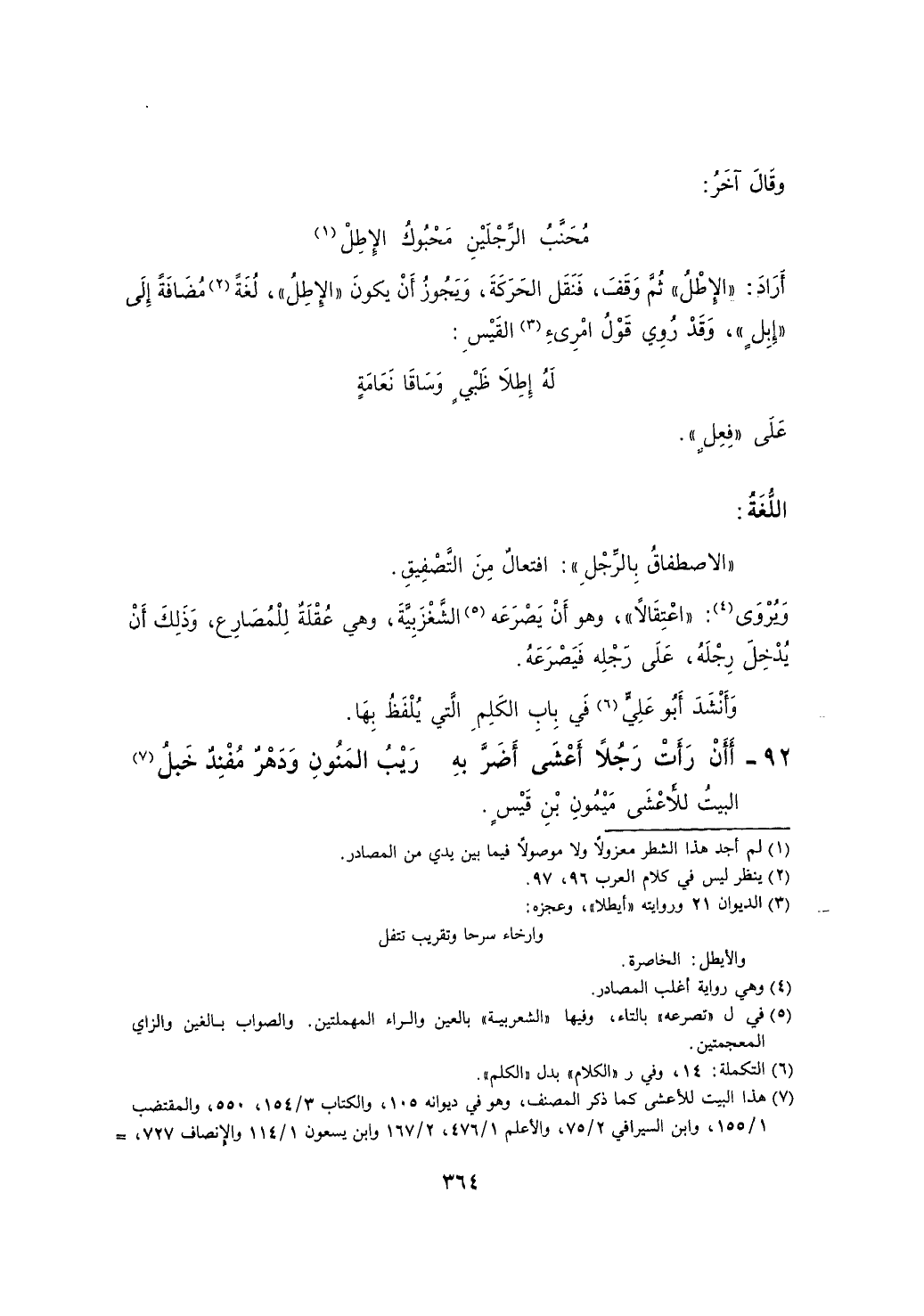 أراد: "الإطل" ثم وقف، فنقل الحركة، ويجوز أن يكون "الإطل"، لغة مضافة إلى "إبل"، وقد روي قول امرئ القيس: