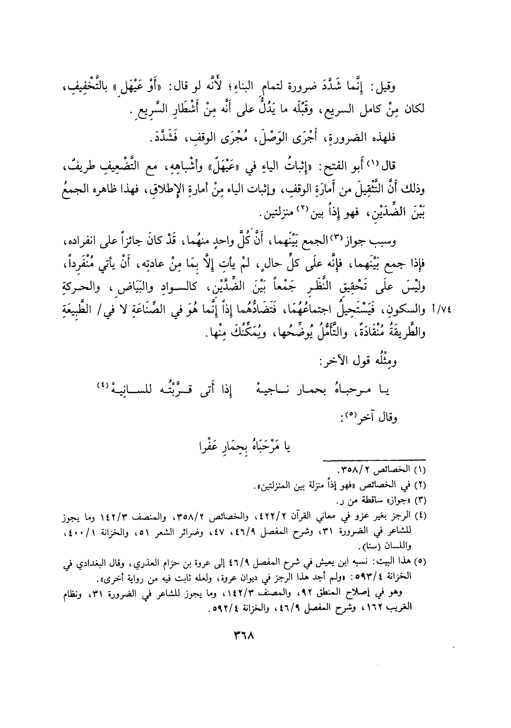 قال أبو الفتح: "إثبات الياء في "عيهل" وأشباهه، مع التضعيف طريف، وذلك أن التثقيل من أمارة الوقف، وإثبات الياء من أمارة الإطلاق، فهذا ظاهره الجمع بين الضدين، فهو إذاً بين منزلتين.