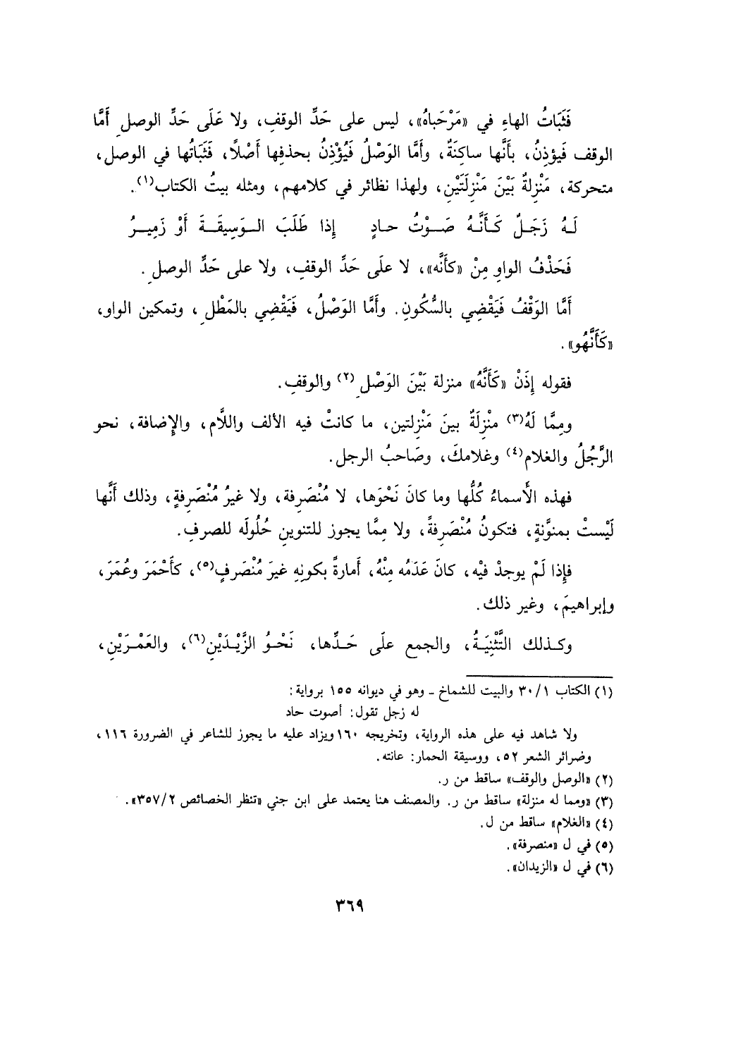 فثبات الهاء في "مرحباه"، ليس على حد الوقف، ولا على حد الوصل أما الوقف فيؤذن، بأنها ساكنة، وأما الوصل فيؤذن بحذفها أصلاً، فثباتها في الوصل، متحركة، منزلة بين منزلتين، ولهذا نظائر في كلامهم، ومثله بيت الكتاب.