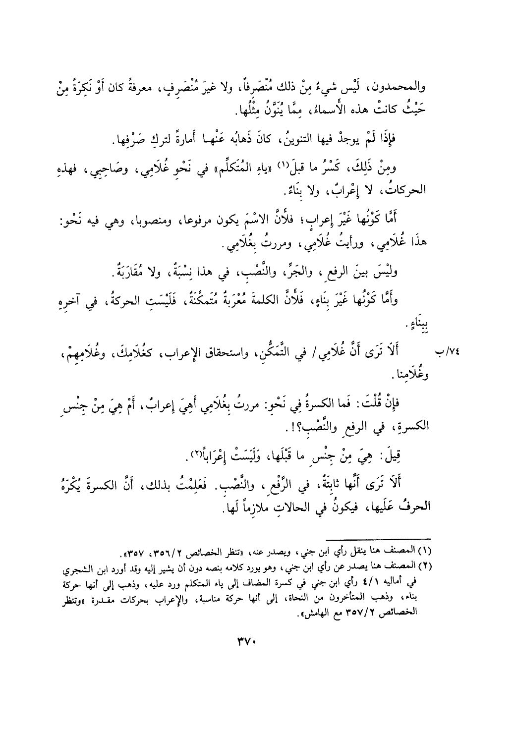 ألا ترى أن غلامي في التمكن، واستحقاق الإعراب، كغلامك، وغلامهم، وغلامنا.
