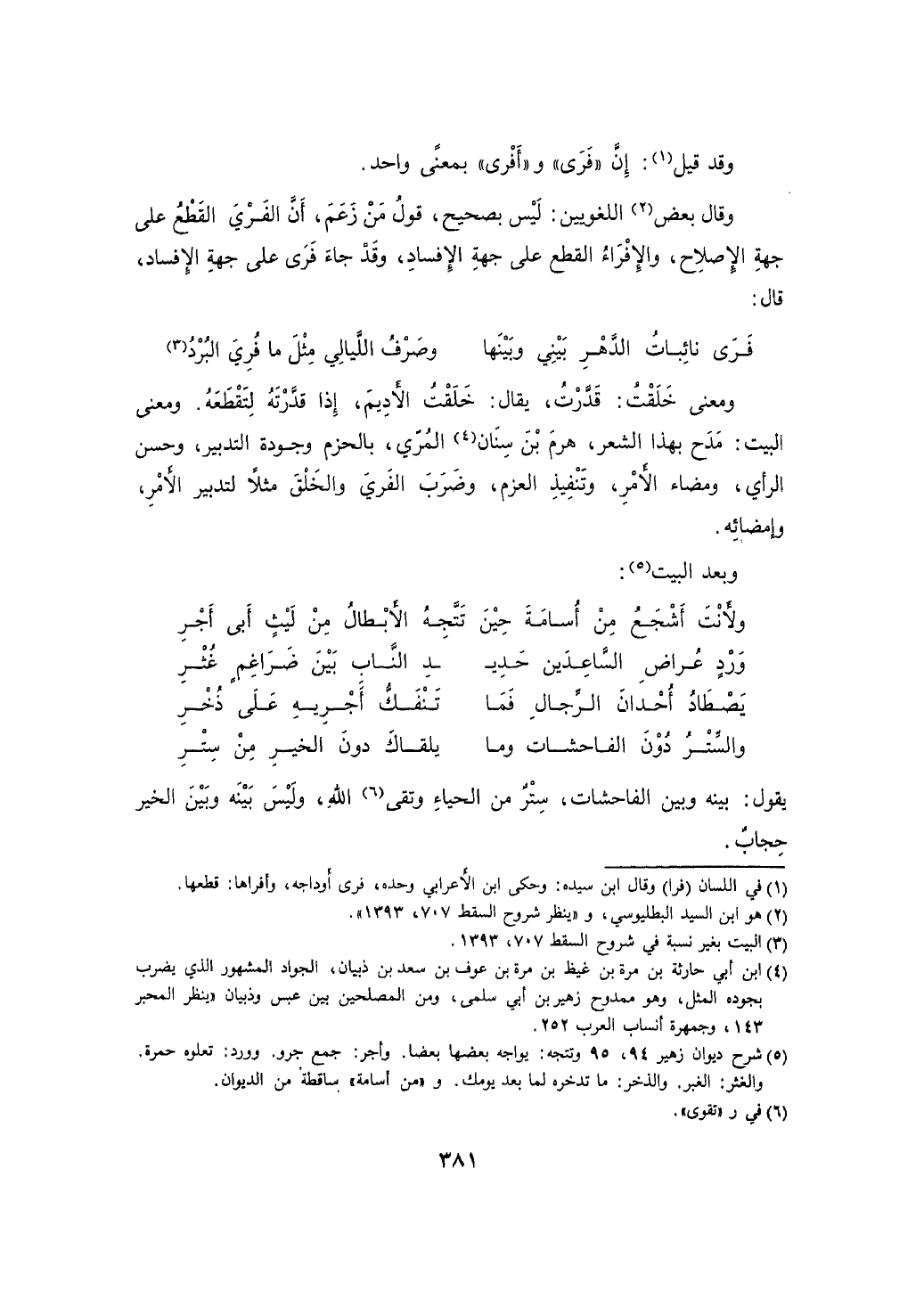 ومعنى خلقت: قدرت، يقال: خلقت الأديم، إذا قدرته لتقطعه، ومعنى البيت: مدح بهذا الشعر، هرم بن سنان، المري، بالحزم وجودة التدبير، حسن الرأي، ومضاء الأمر، وتنفيذ العزم، وضرب الفري والخلق مثلاً لتدبير الأمر، وإمضائه.
