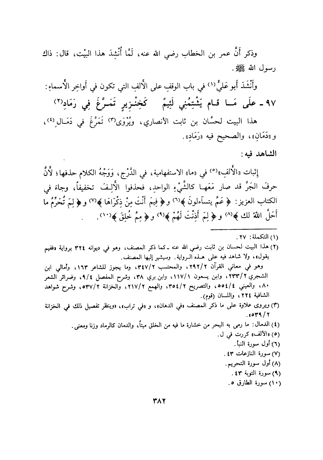 إثبات "الألف" في "ما" الاستفهامية في الدرج، وجه الكلام حذفها، لأن حرف الجر قد صار معها كالشيء الواحد، فحذفوا الألف تخفيفاً، وجاء في الكتاب العزيز: (عمَّ يتسآءلونَ) و (فيمَ أنتَ منْ ذكرها) و (لمَ تحرمَ ما أحلَّ الله لك) و (لم أذنتَ لهم) و (ممَّ خلقَ) .