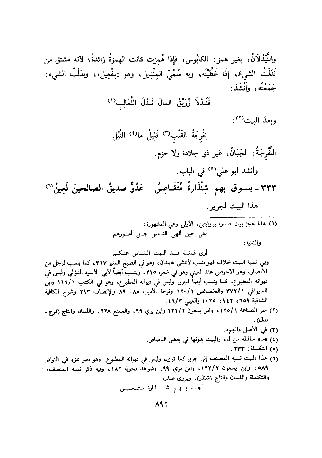 والنيدلان، بغير همز: الكابوس، فإذا همزت كانت الهمزة زائدة، لأنه مشتق من ندلت الشيء، إذا غطيته، وبه سمي المنديل، وهو"مفعيل"، وندلت الشيء: جمعته، وأنشد: