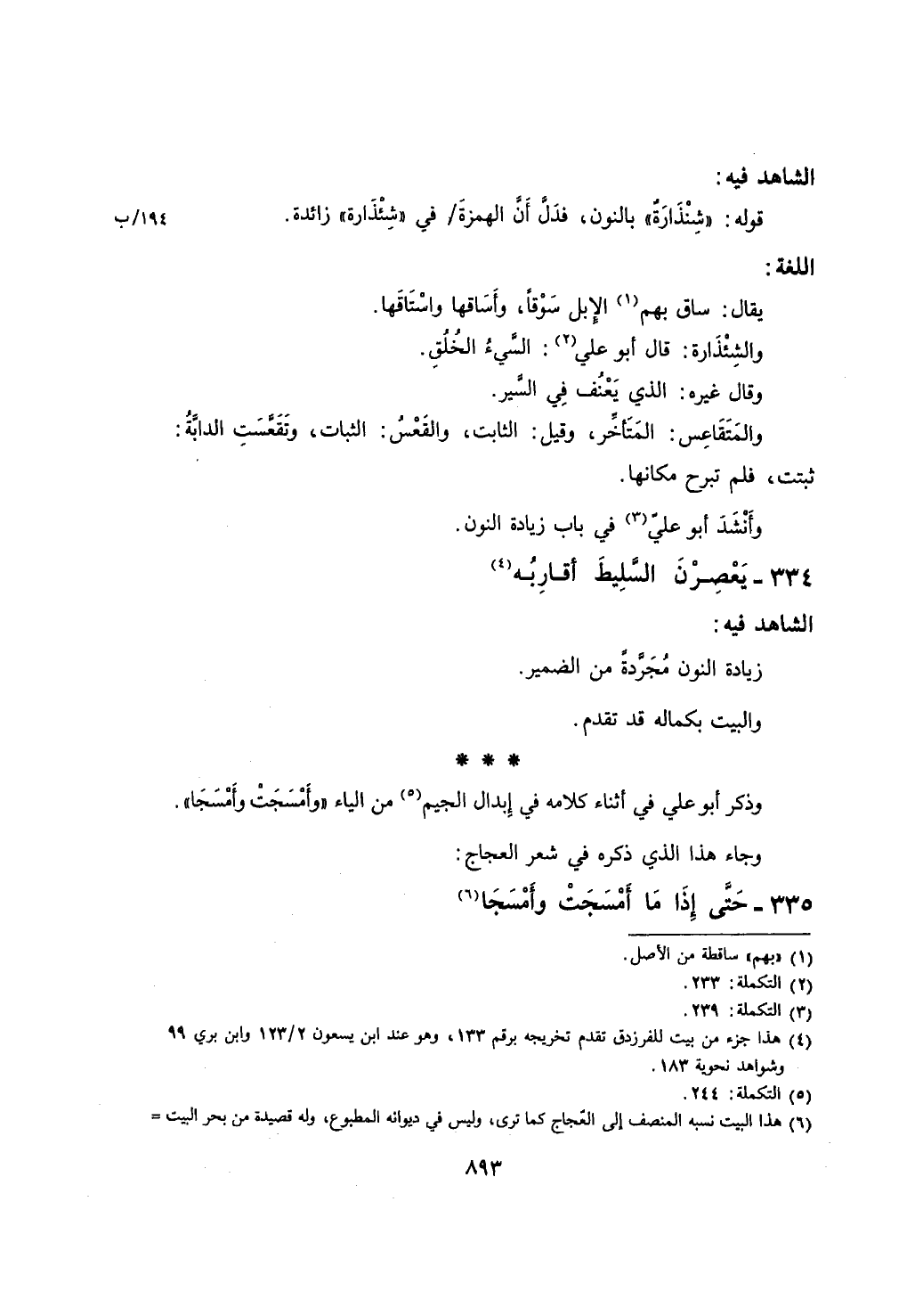 قوله: "شنذارة" بالنون، فدل أنم الهمزة في "شئذارة" زائدة.