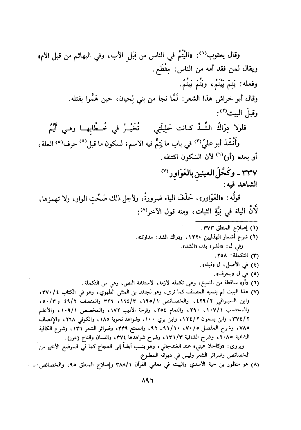 وأنشد أبو علي في باب ما يتم فيه الاسم، لسكون ما قبل حرف العلة، أو بعده (أو) لأن السكون اكتنفه.