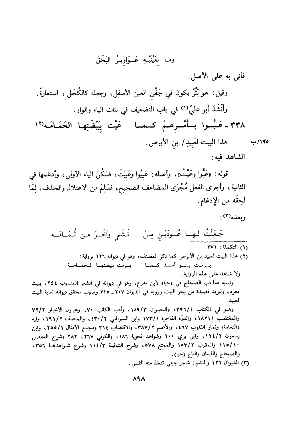 قوله: "عيُّوا وعيَّت"، وأصله: عييوا وعييت، فسكن الياء الأولى، وأدغمها في الثانية، وأجرى الفعل مجرى المضاعف الصحيح، فسلم من الاعتلال والحذف، لما لحقه من الإدغام.