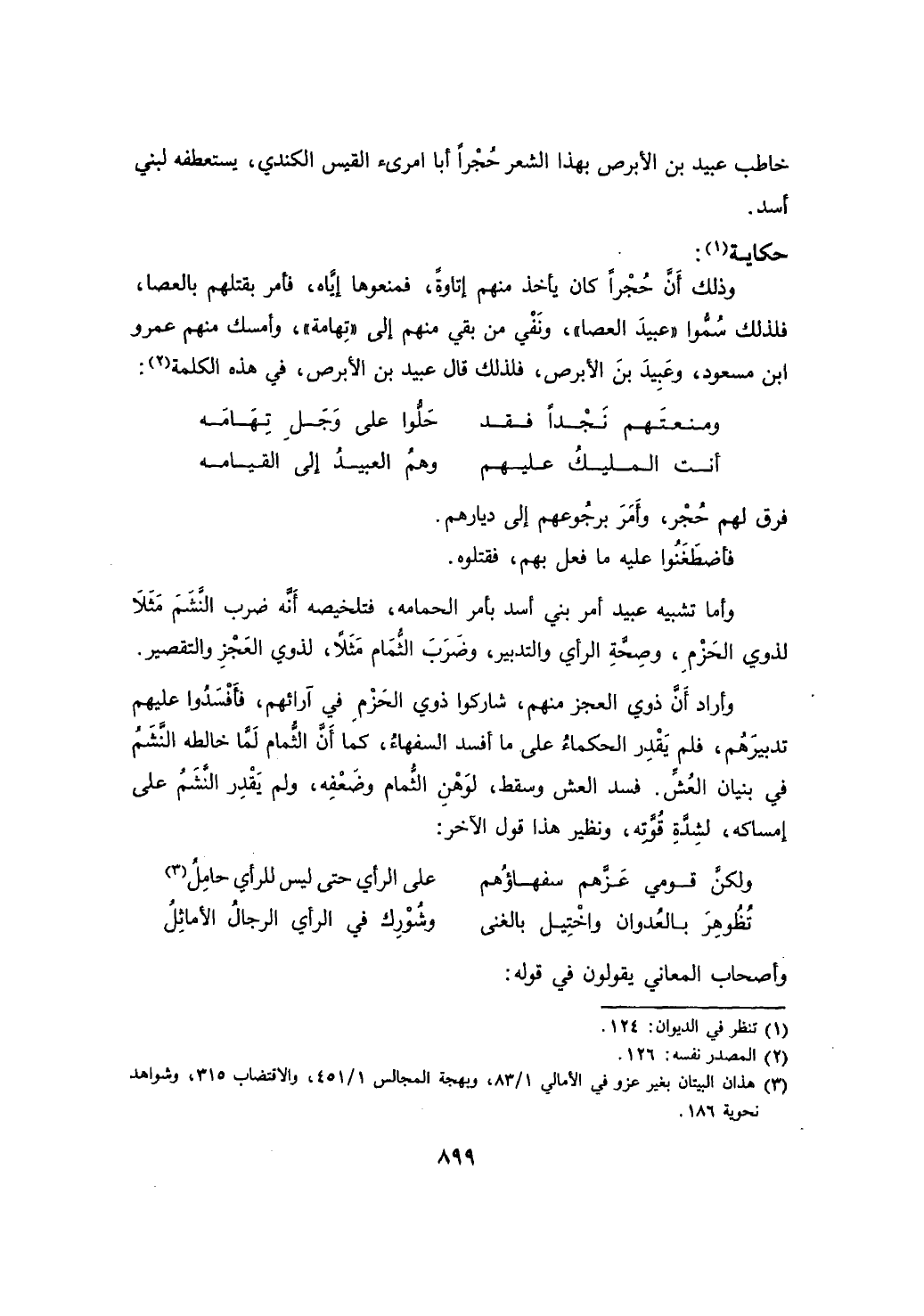 وأما تشبيه عبيد أمر بني أسد بأمر الحمامه، فتلخيصه أنه ضرب النشم مثلا لذوي الحزم، وصحة الرأي والتدبير، وضرب الثمام مثلا، لذوي العجز والتقصير.