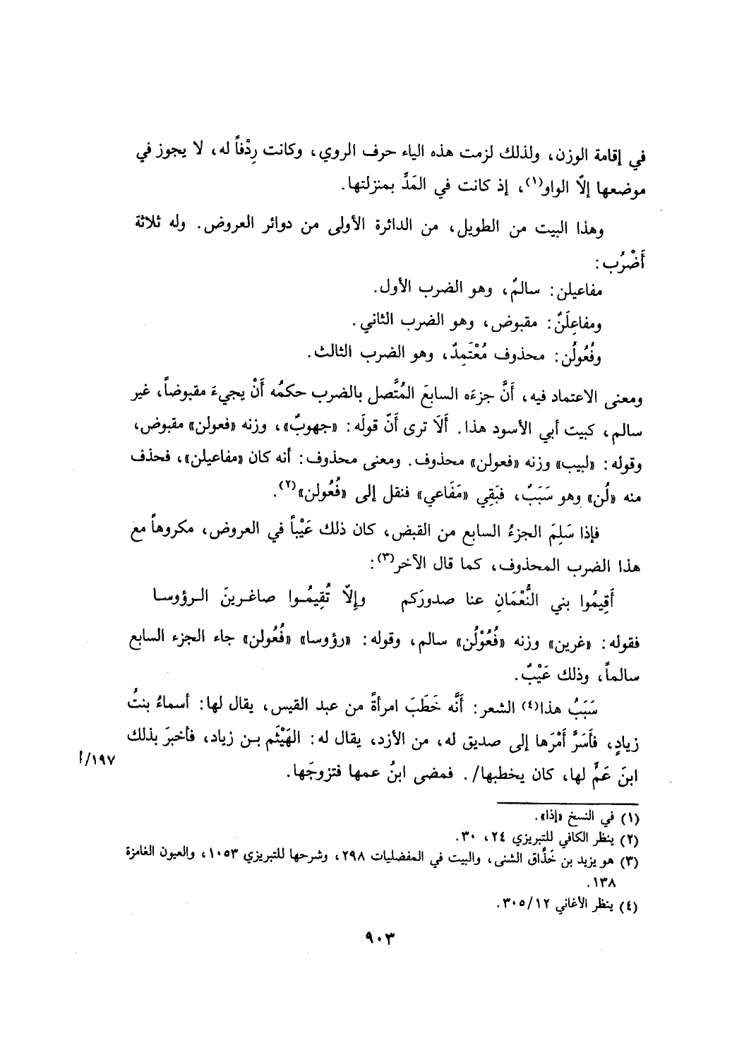 ومعنى الاعتماد فيه، أن جزءه السابع المتصل بالضرب حكمه أن يجيء مقبوضاً، غير سالم، كبيت أبي الأسود هذا. ألا ترى أن قوله: "جهوب"، وزنه "فعولن" مقبوض، وقوله: "لبيب" وزنه "فعولن" محذوف. ومعنى محذوف: أنه كان "مفاعلين"، فحذف منه "لن" وهو سبب، فبقي"مفاعي" فنقل إلى "فعولن".