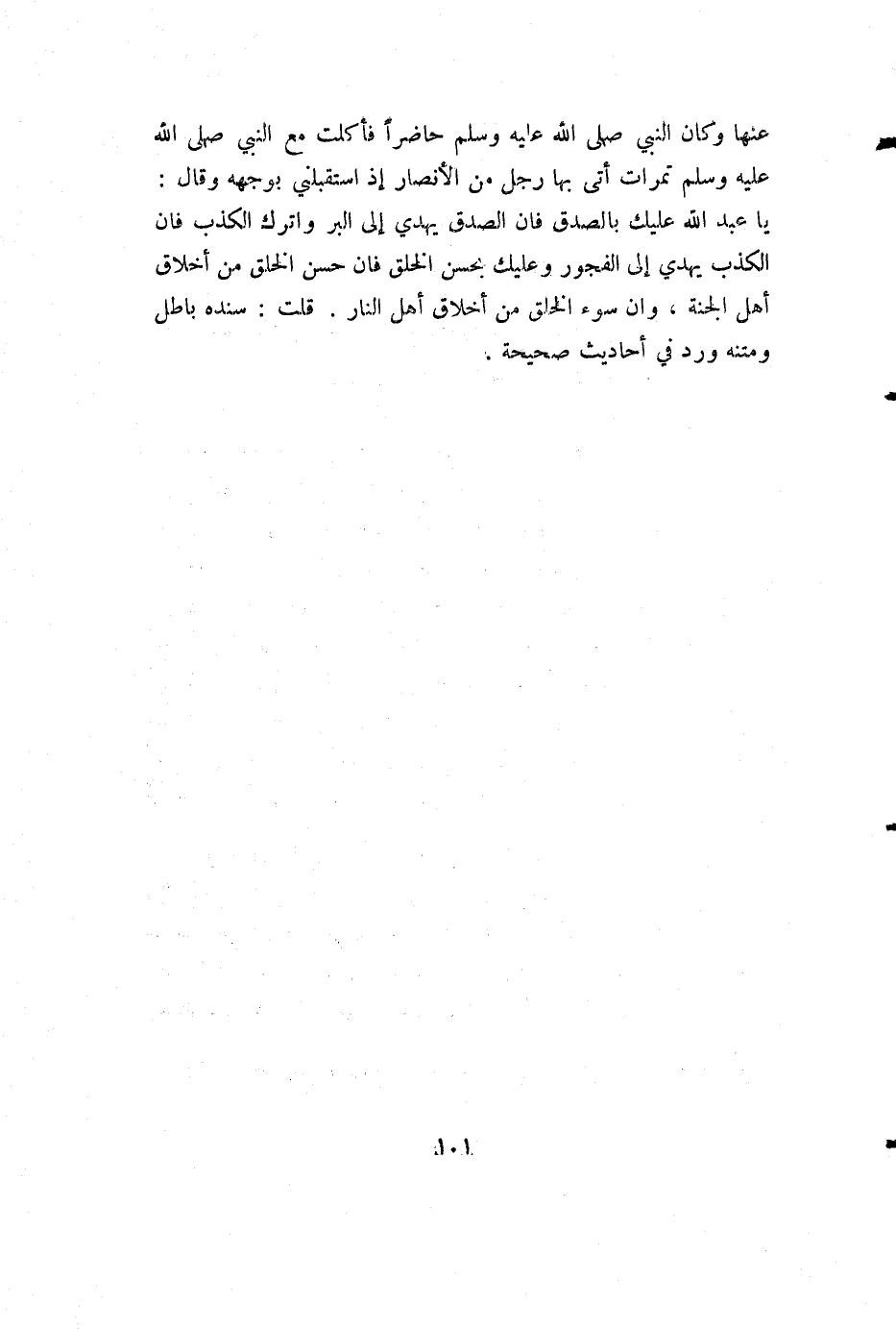 عنها وكان النبي صلى الله عليه وسلم حاضرا فأكلت مع النبي صلى الله عليه وسلم تمرات أتى بها رجل من الأنصار إذ استقبلني بوجهه وقال: يا عبد الله عليك بالصدق فإن الصدق يهدي إلى البر واترك الكذب فإن الكذب يهدي إلى الفجور وعليك بحسن الخلق فإن حسن الخلق من أخلاق أهل الجنة، وإن سوء الخلق من أخلاق أهل النار. قلت: سنده باطل ومتنه ورد في أحاديث صحيحة.