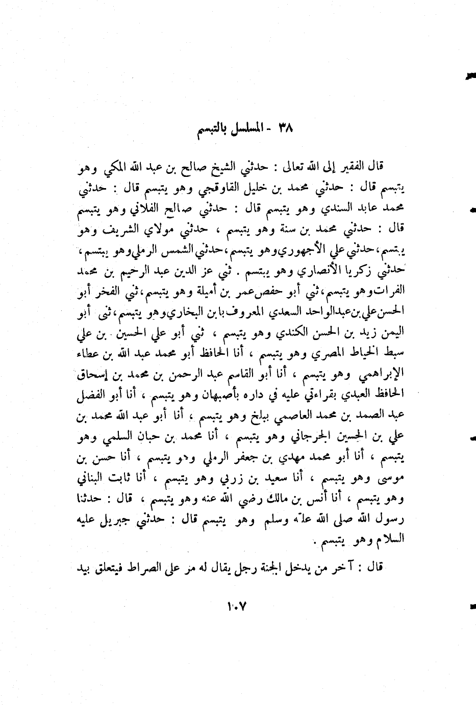 قال الفقير إلى الله تعالى: حدثني الشيخ صالح بن عبد الله المكي وهو يتبسم قال: حدثني محمد بن خليل القاوقجي وهو يتبسم قال: حدثني محمد عابد السندي وهو يتبسم قال: حدثني صالح الفلاني وهو يتبسم قال: حدثني محمد بن سنة وهو يتبسم، حدثني مولاي الشريف وهو يتبسم، حدثني علي الأجهوري وهو يتبسم، حدثني الشمس الرملي وهو يتبسم، حدثني زكريا الأنصاري وهو يتبسم. ثني عز الدين عبد الرحيم بن محمد الفرات وهو يتبسم، ثني أبو حفص عمر بن أميلة وهو يتبسم، ثني الفخر أبو الحسن علي بن عبد الواحد السعيد المعروف بابن البخاري وهو يتبسم، ثني أبو اليمن زيد بن الحسن الكندي وهو يتبسم، ثني أبو علي الحسين بن علي سبط الخياط المصري وهو يتبسم، أنا الحافظ أبو محمد عبد الله بن عطاء الإبراهمي وهو يتبسم، أنا أبو القاسم عبد الرحمن بن محمد بن إسحاق الحافظ العبدي بقراءتي عليه في داره بأصبهان وهو يتبسم، أنا أبو الفضل عبد الصمد بن محمد العاصمي ببلخ وهو يتبسم، أنا أبو عبد الله محمد بن علي بن الحسين الجرجاني وهو يتبسم، أنا محمد بن حبان السلمي وهو يتبسم، أنا أبو محمد مهدي بن جعفر الرملي وهو يتبسم، أنا حسن بن موسى وهو يتبسم، أنا سعيد بن زربي وهو يتبسم، أنا ثابت البناني وهو يتبسم، أنا أنس بن مالك رضي الله عنه وهو يتبسم، قال: حدثنا رسول الله صلى الله عليه وسلم وهو يتبسم قال: حدثني جبريل عليه السلام وهو يتبسم.