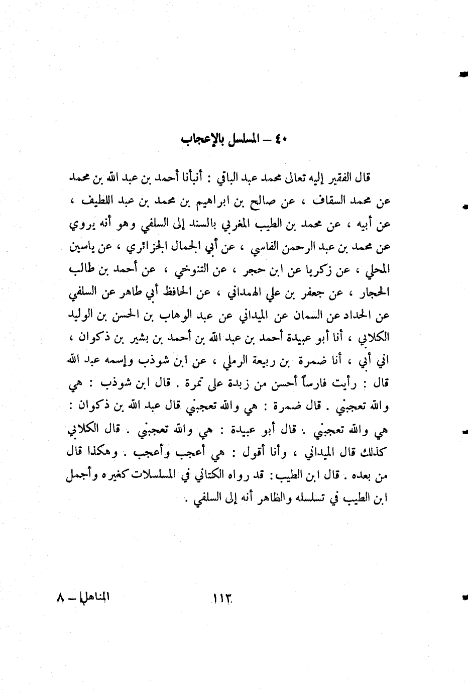 قال الفقير إليه تعالى محمد عبد الباقي: أنبأنا أحمد بن عبد الله بن محمد عن محمد السقاف، عن صالح بن إبراهيم بن محمد بن عبد اللطيف، عن أبيه، عن محمد بن الطيب المغربي بالسند إلى السلفي وهو أنه يروي عن محمد بن عبد الرحمن الفاسي، عن أبي الجمال الجزائري، عن ياسين المحلي، عن زكريا عن ابن حجر، عن التنوخي، عن أحمد بن طالب الحجار، عن جعفر بن علي الهمداني، عن الحافظ أبي طاهر عن السلفي عن الحداد عن السمان عن الميداني عن عبد الوهاب بن الحسن بن الوليد الكلابي، أنا أبو عبيدة أحمد بن عبد الله بن أحمد بن بشير بن ذكوان، أني أبي، أنا ضمرة بن ربيعة الرملي، عن ابن شوذب واسمه عبد الله قال: رأيت فارسا أحسن من زبدة على تمرة. قال ابن شوذب: هي والله تعجبني. قال ضمرة: هي والله تعجبني قال عبد الله بن ذكوان: هي والله تعجبني. قال أبو عبيدة: هي والله تعجبني. قال الكلابي كذلك قال الميداني، وأنا أقول: هي أعجب وأعجب. وهكذا قال من بعده. قال ابن الطيب: قد رواه الكتاني في المسلسلات كغيره وأجمل ابن الطيب في تسلسله والظاهر أنه إلى السلفي.