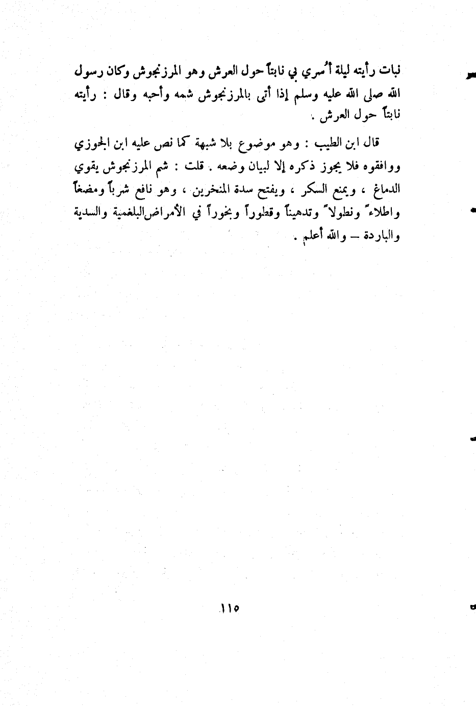 نبات رأيته ليلة أُسري بي نابتا حول العرش وهو المرزنجوش وكان رسول الله صلى الله عليه وسلم إذا أتى بالمرزنجوش شمه وأحبه وقال: رأيته نابتا حول العرش.