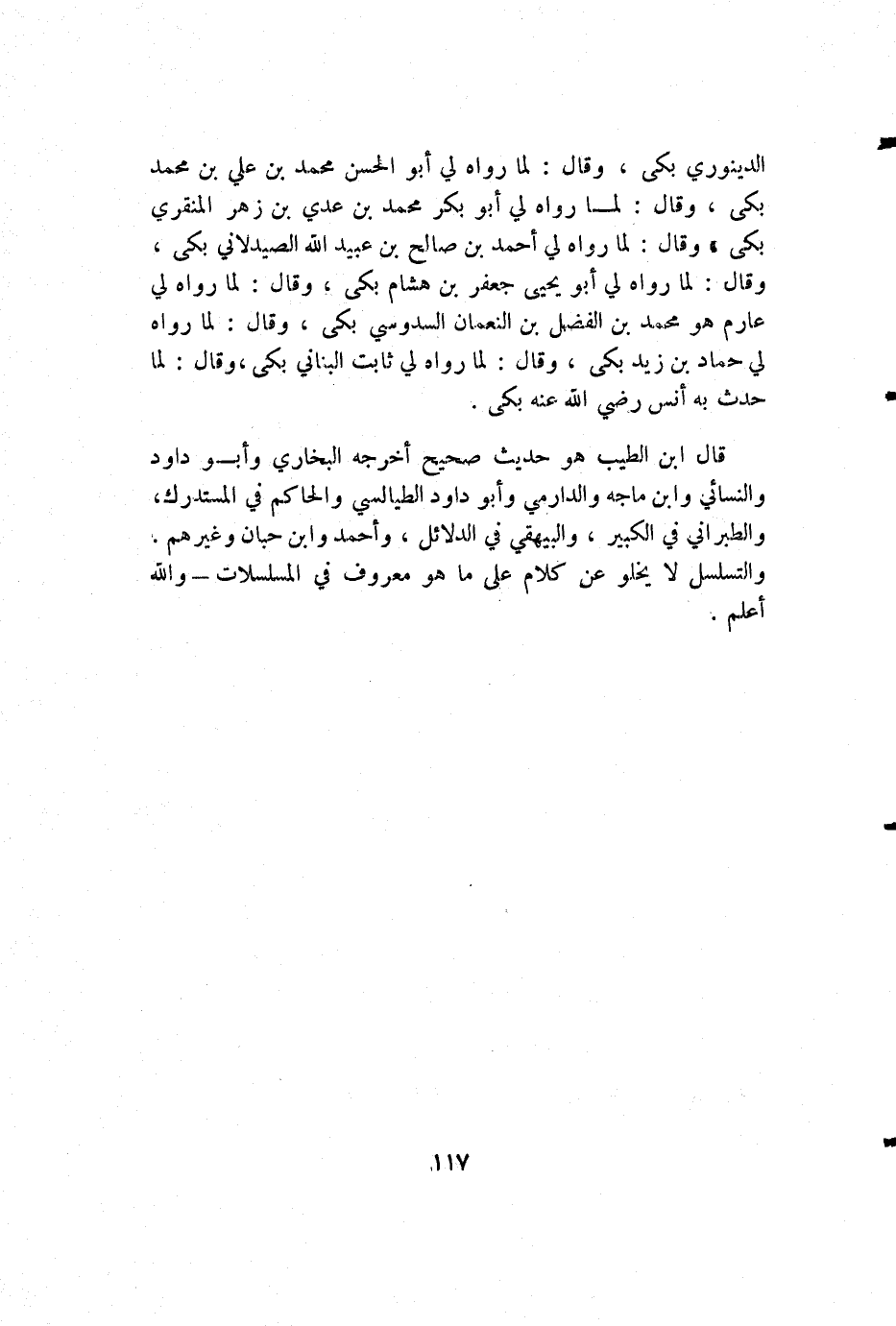 الدينوري بكى، وقال: لما رواه لي أبو الحسن محمد بن علي بن محمد بكى، وقال: لما رواه لي أبو بكر محمد بن عدي بن زهر المنقري بكى، وقال: لما رواه لي أحمد بن صالح بن عبيد الله الصيدلاني بكى، وقال: لما رواه لي أبو يحيى جعفر بن هشام بكى، وقال: لما رواه لي عارم هو محمد بن الفضل بن النعمان السدوسي بكى، وقال: لما رواه لي حماد بن زيد بكى، وقال: لما رواه لي ثابت البناني بكى، وقال: لما حدث به أنس رضي الله عنه بكى.