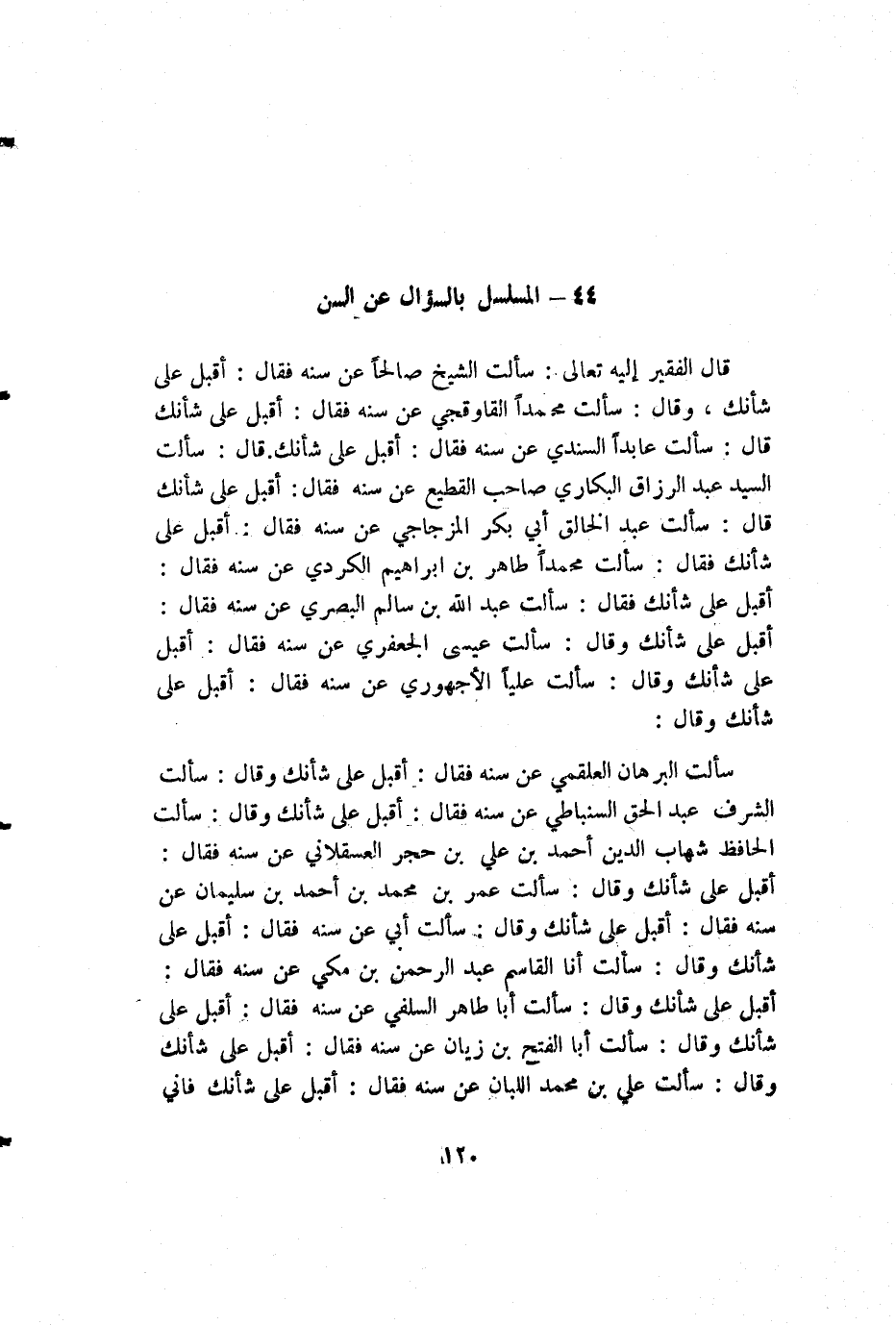 قال الفقير إليه تعالى: سألت الشيخ صالحا عن سنه فقال: أقبل على شأنك، وقال: سألت محمدا القاوقجي عن سنه فقال: أقبل على شأنك قال: سألت عابدا السندي عن سنه فقال: أقبل على شأنك. قال: سألت السيد عبد الرزاق البكاري صاحب القطيع عن سنه فقال: أقبل على شأنك قال: سألت عبد الخالق أبي بكر المزجاجي عن سنه فقال: أقبل على شأنك فقال: سألت محمدا طاهر بن إبراهيم الكردي عن سنه فقال: أقبل على شأنك فقال: سألت عبد الله بن سالم البصري عن سنه فقال: أقبل على شأنك وقال: سألت عيسى الجعفري عن سنه فقال: أقبل على شأنك وقال: سألت عليا الأجهوري عن سنه فقال: أقبل على شأنك وقال: