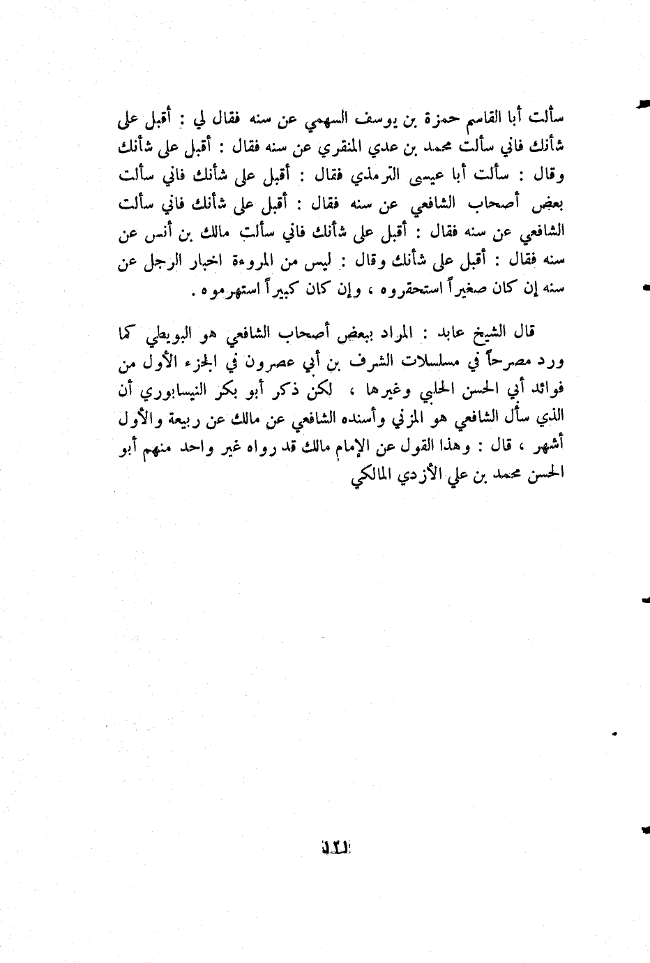 قال الشيخ عابد: المراد ببعض أصحاب الشافعي هو البويطي كما ورد مصرحا في مسلسلات الشرف بن أبي عصرون في الجزء الأول من فوائد أبي الحسن الحلبي وغيرها، لكن ذكر أبو بكر النيسابوري أن الذي سأل الشافعي هو المزني وأسنده الشافعي عن مالك عن ربيعة والأول أشهر، قال: وهذا القول عن الإمام مالك قد رواه غير واحد منهم أبو الحسن محمد بن علي الأزدي المالكي.