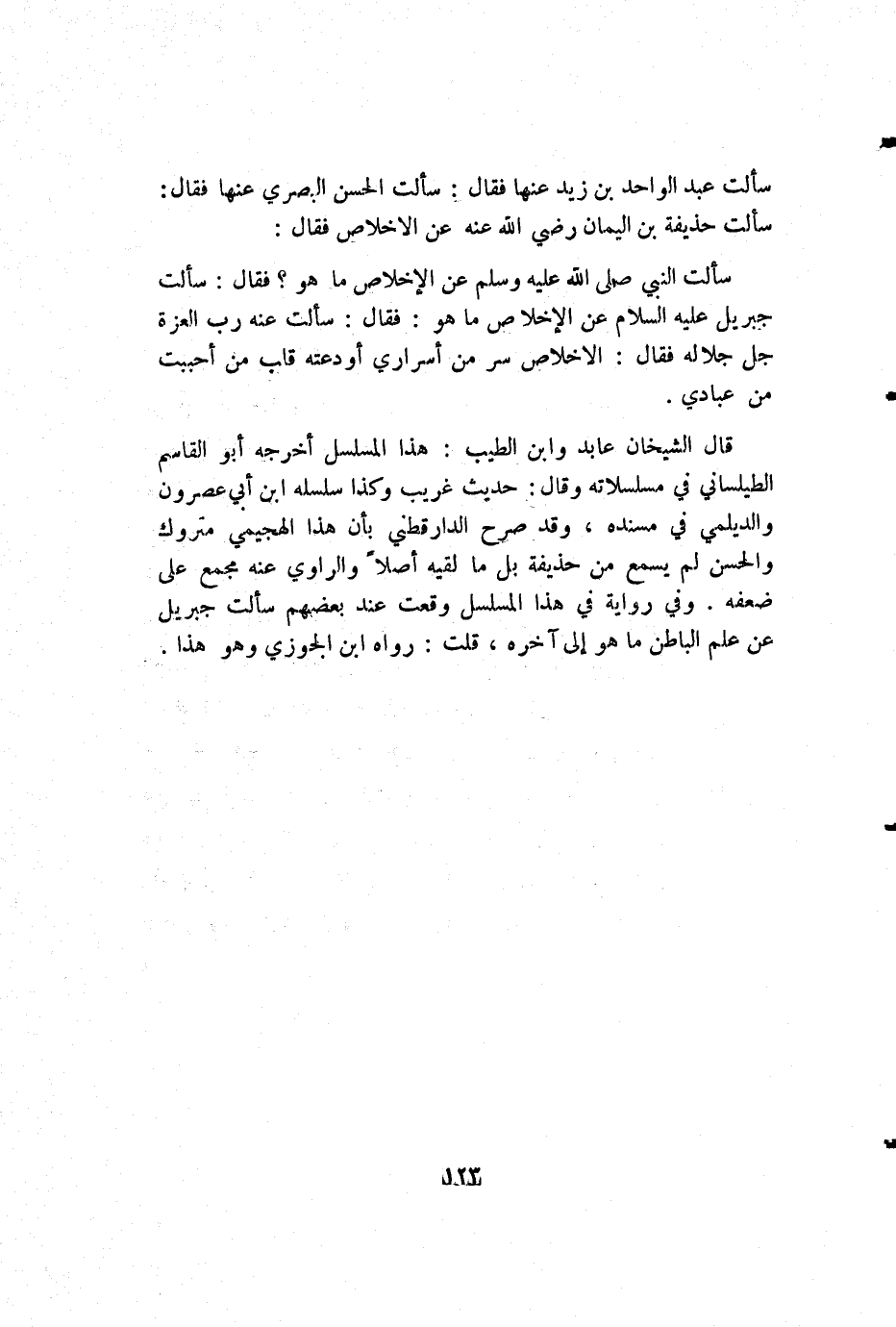 سألت عبد الواحد بن زيد عنها فقال: سألت الحسن البصري عنها فقال: سألت حذيفة بن اليمان رضي الله عنه عن الإخلاص فقال: