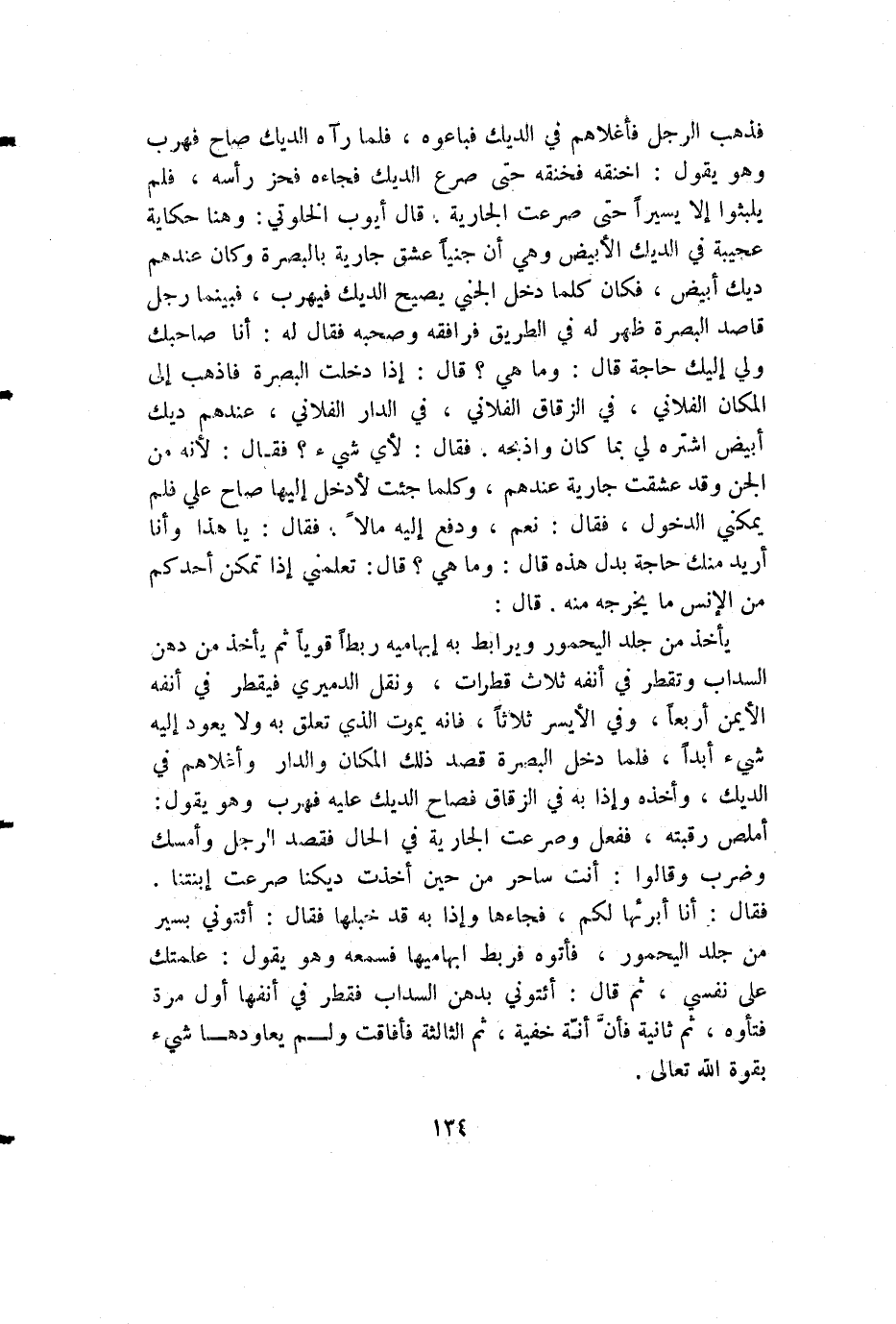فذهب الرجل فأغلاهم في الديك فباعوه، فلما رآه الديك صاح فهرب وهو يقول: اخنقه فخنقه حتى صرع الديك فجاءه فحز رأسه، فلم يلبثوا إلا يسيراً حتى صرعت الجارية. قال أيوب الخلوتي: وهنا حكاية عجيبة في الديك الأبيض وهي أن جنياً عشق جارية بالبصرة وكان عندهم ديك أبيض، فكان كلما دخل الجني يصيح الديك فيهرب، فبينما رجل قاصد البصرة ظهر له في الطريق فرافقه وصحبه فقال له: أنا صاحبك ولي إليك حاجة قال: وما هي؟ قال: إذا دخلت البصرة فاذهب إلى المكان الفلاني، في الزقاق الفلاني، في الدار الفلاني، عندهم ديك أبيض اشتره لي بما كان واذبحه. فقال: لأي شيء؟ فقال: لأنه من الجن وقد عشقت جارية عندهم، وكلما جئت لأدخل إليها صاح علي فلم يمكني الدخول، فقال: نعم، ودفع إليه مالاً. فقال: يا هذا وأنا أريد منك حاجة بدل هذه قال: وما هي؟ قال: تعلمني إذا تمكن أحدكم من الإنس ما يخرجه منه. قال:
