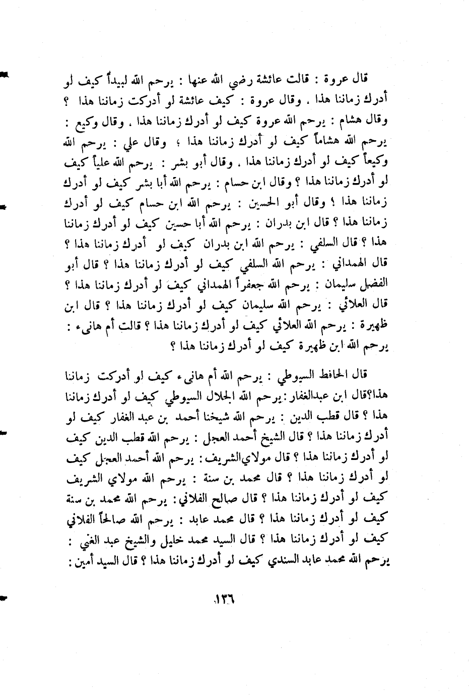 قال عروة: قالت عائشة رضي الله عنها: يرحم الله لبيداً كيف لو أدرك زماننا هذا. وقال عروة: كيف عائشة لو أدركت زماننا هذا؟ وقال هشام: يرحم الله عروة كيف لو أدرك زماننا هذا، وقال وكيع: يرحم الله هشاماً كيف لو أدرك زماننا هذا؛ وقال علي: يرحم الله وكيعاً كيف لو أدرك زماننا هذا. وقال أبو بشر: يرحم الله عليا كيف لو أدرك زماننا هذا؟ وقال ابن حسام: يرحم الله أبا بشر كيف لو أدرك زماننا هذا؟ وقال أبو الحسين: يرحم الله ابن حسام كيف لو أدرك زماننا هذا؟ قال ابن بدران: يرحم الله أبا حسين كيف لو أدرك زماننا هذا؟ قال السلفي: يرحم الله ابن بدران كيف لو أدرك زماننا هذا؟ قال الهمداني: يرحم الله السلفي كيف لو أدرك زماننا هذا؟ قال أبو الفضل سليمان: يرحم الله جعفراً الهمداني كيف لو أدرك زماننا هذا؟ قال العلائي: يرحم الله سليمان كيف لو أدرك زماننا هذا؟ قال ابن ظهيرة: يرحم الله العلائي كيف لو أدرك زماننا هذا؟ قالت أم هانئ: يرحم الله ابن ظهيرة كيف لو أدرك زماننا هذا؟