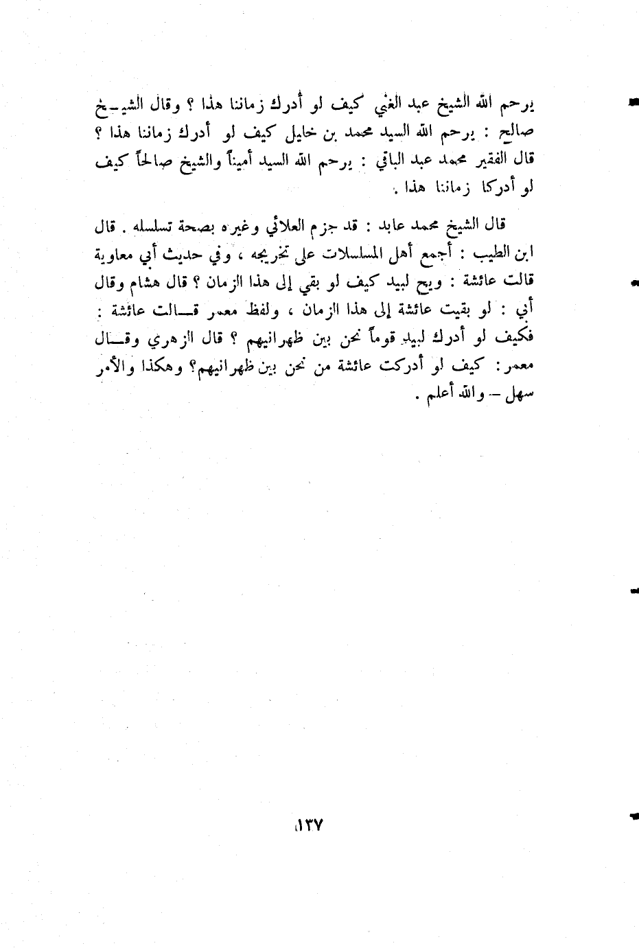 يرحم الله الشيخ عبد الغني كيف لو أدرك زماننا هذا؟ وقال الشيخ صالح: يرحم الله السيد محمد بن خليل كيف لو أدرك زماننا هذا؟ قال الفقير محمد عبد الباقي: يرحم الله السيد أمينا والشيخ صالحا كيف لو أدركا زماننا هذا.