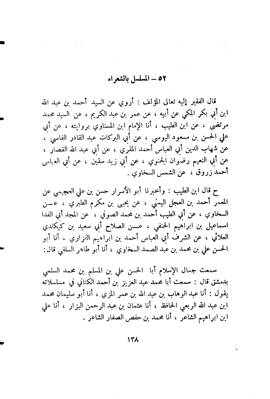 قال الفقير إليه تعالى المؤلف: أروي عن السيد أحمد بن عبد الله ابن أبي بكر المكي عن أبيه، عن عمر بن عبد الكريم، عن السيد محمد مرتضى، عن ابن الطيب، أنا الإمام ابن المسناوي بروايته، عن أبي علي الحسن بن مسعود اليوسي، عن أبي البركات عبد القادر الفاسي، عن شهاب الدين أبي العباس أحمد المقري، عن أبي عبد الله القصار، عن أبي النعيم رضوان الجنوي، عن أبي زيد سقين، عن أبي العباس أحمد زروق، عن الشمس السخاوي.